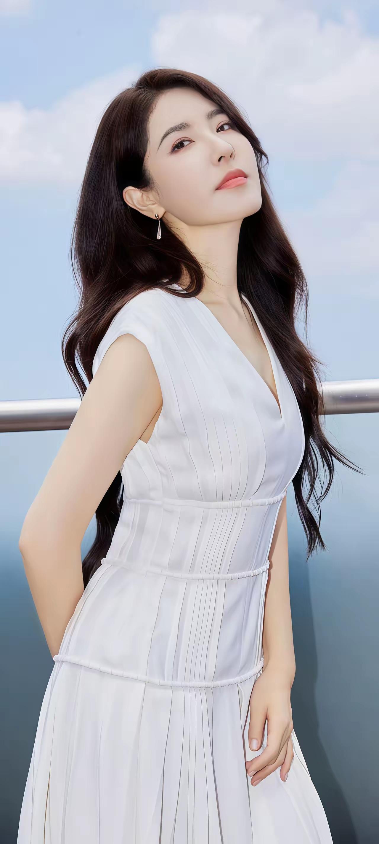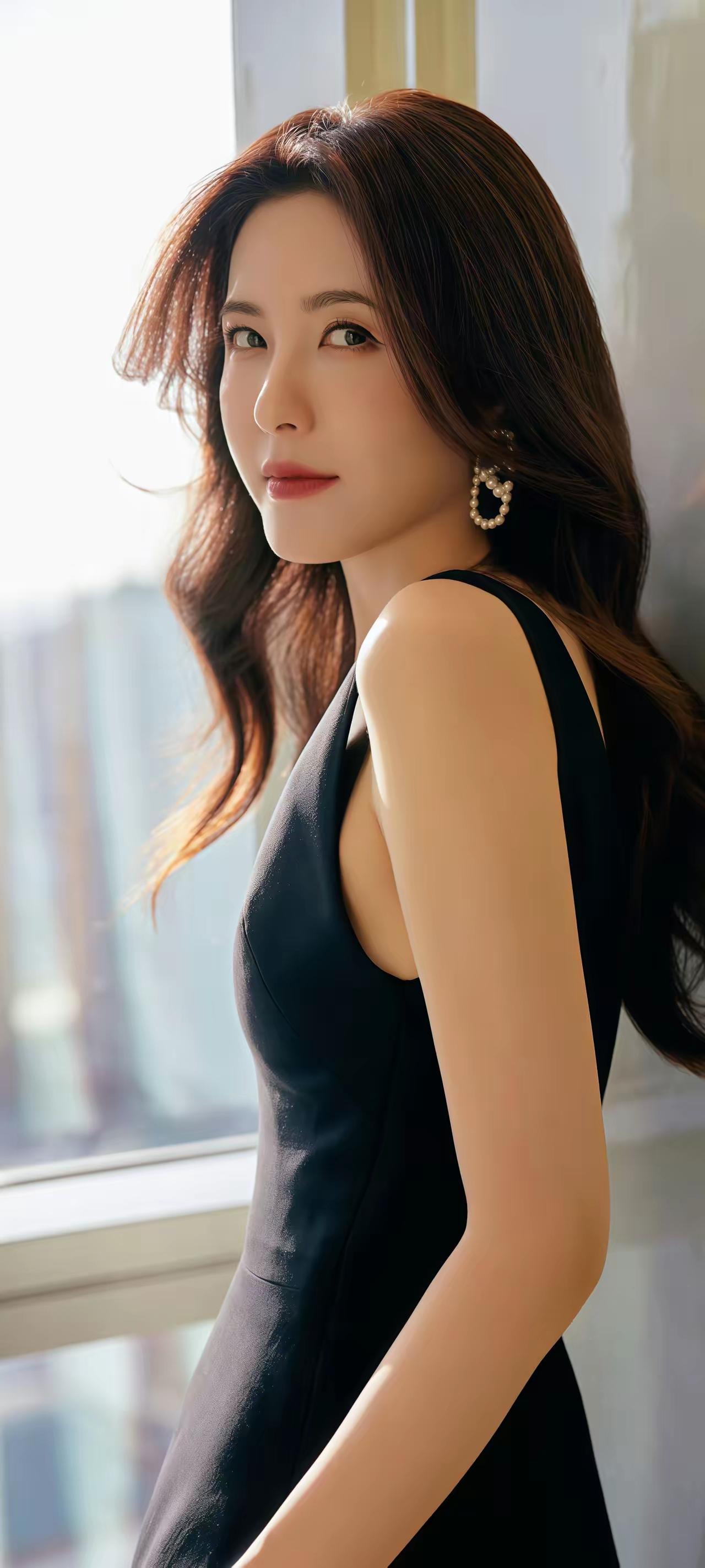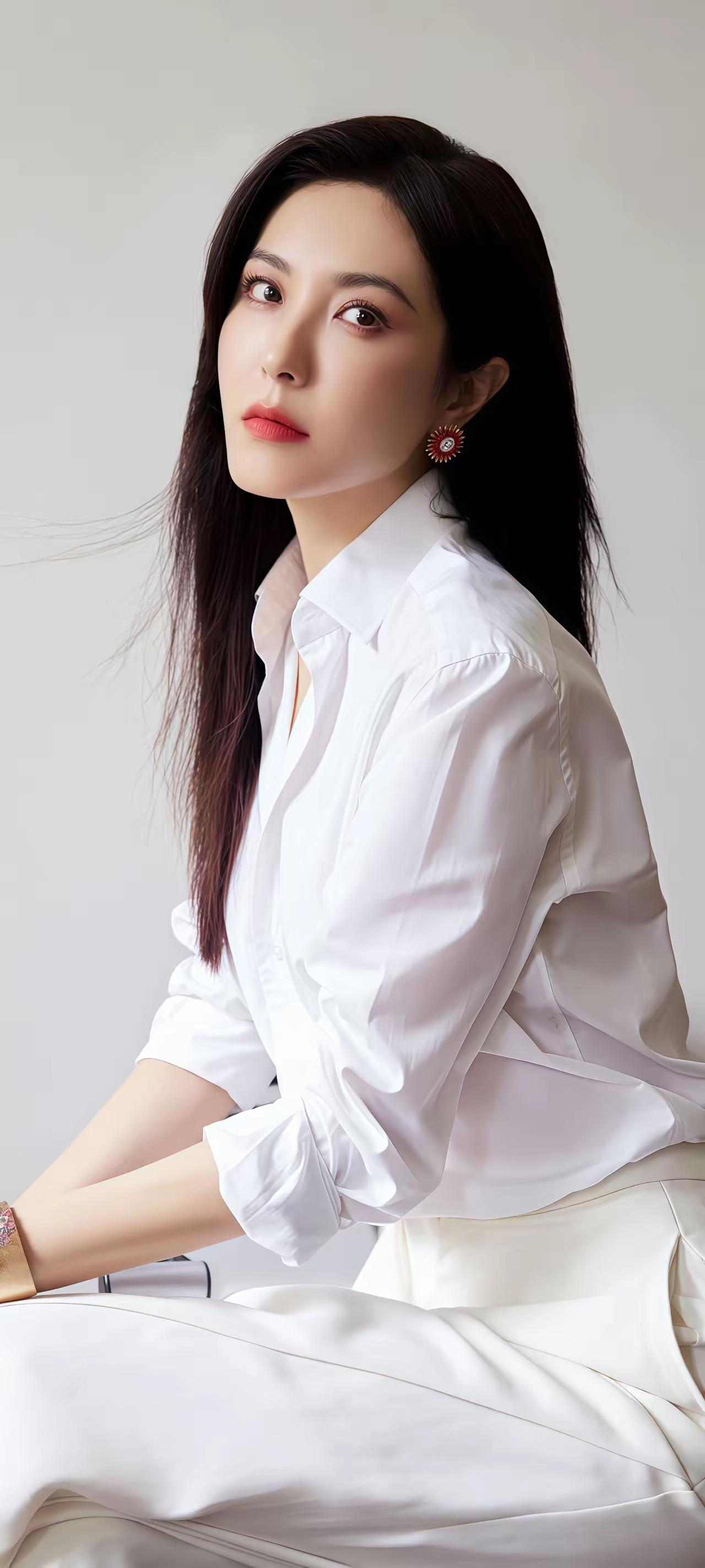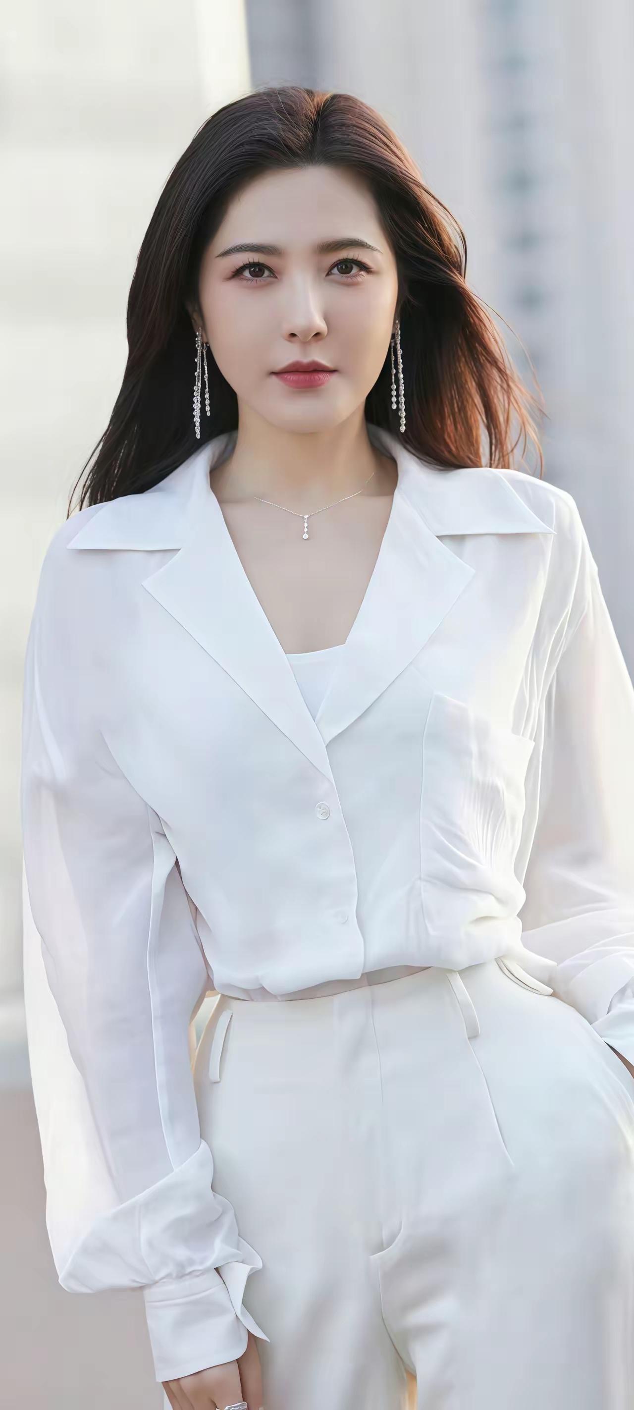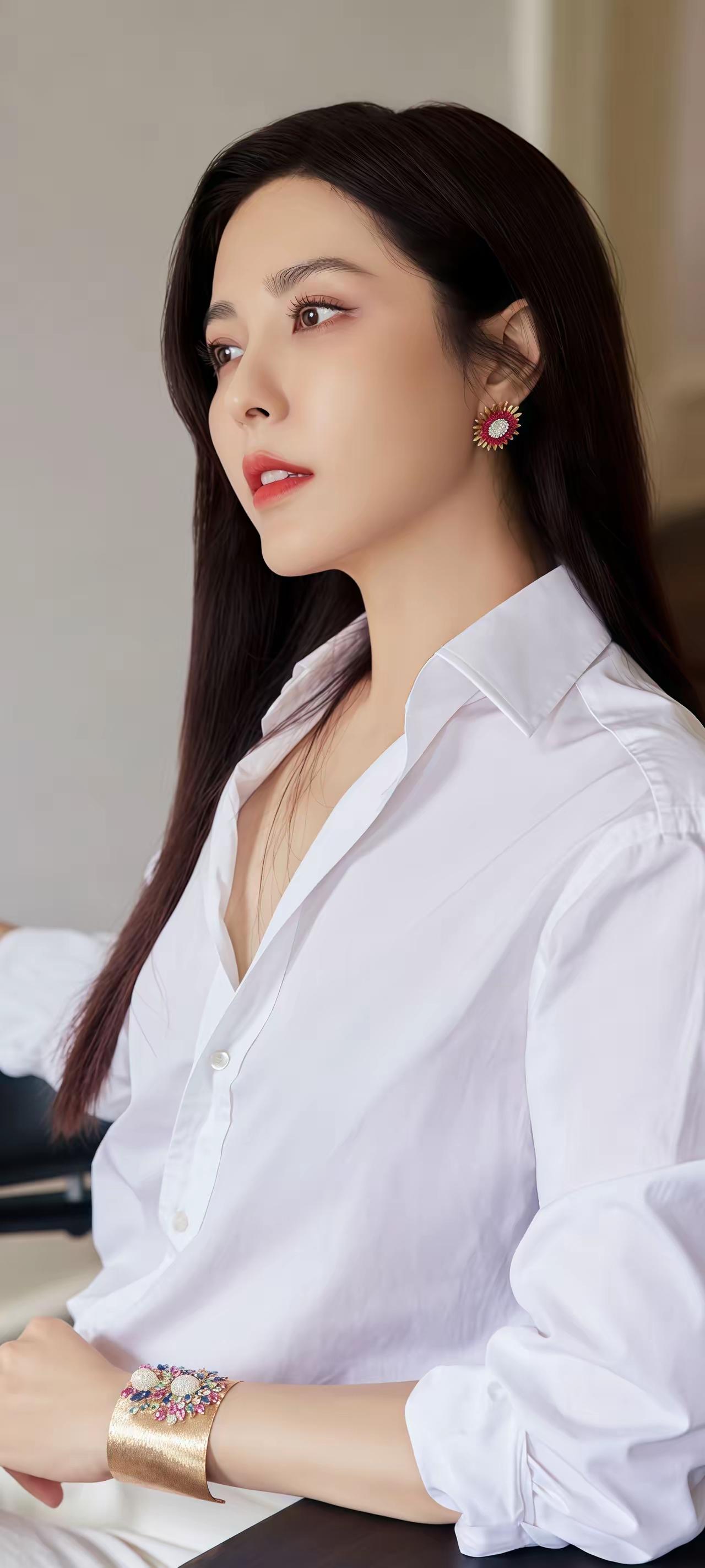 优雅白衬衫,红唇与耳环相映成趣,尽显都市女性魅力。