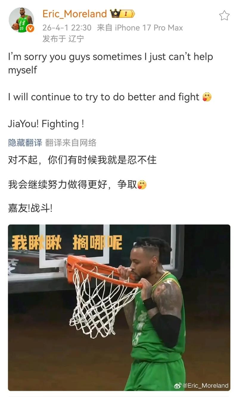 莫兰德赛后第一时间发微博给大家道歉,因为莫兰德在比赛中扣篮后一个挂筐动作被裁判给了一个技术犯规。莫兰德在微博中写道:对不起你们,有时候真的忍不住。我会努力做的更好,加油!战斗! 莫兰德就是一个这样人,球打兴奋了就控制不住自己,这时的莫兰德也是状态最好的时候。而一旦莫兰德打的不顺了,那他就跟霜打的茄子一样蔫了。 所以还是希望莫兰德能够打高兴了,这样一个技术犯规就当是一个小插曲了。还有就是你们发现没有,莫兰德重新回到辽宁队后微博开始不断更新了,而在广东队时从来没写过微博,微博认证上也一直没变写的还是辽宁队球员。