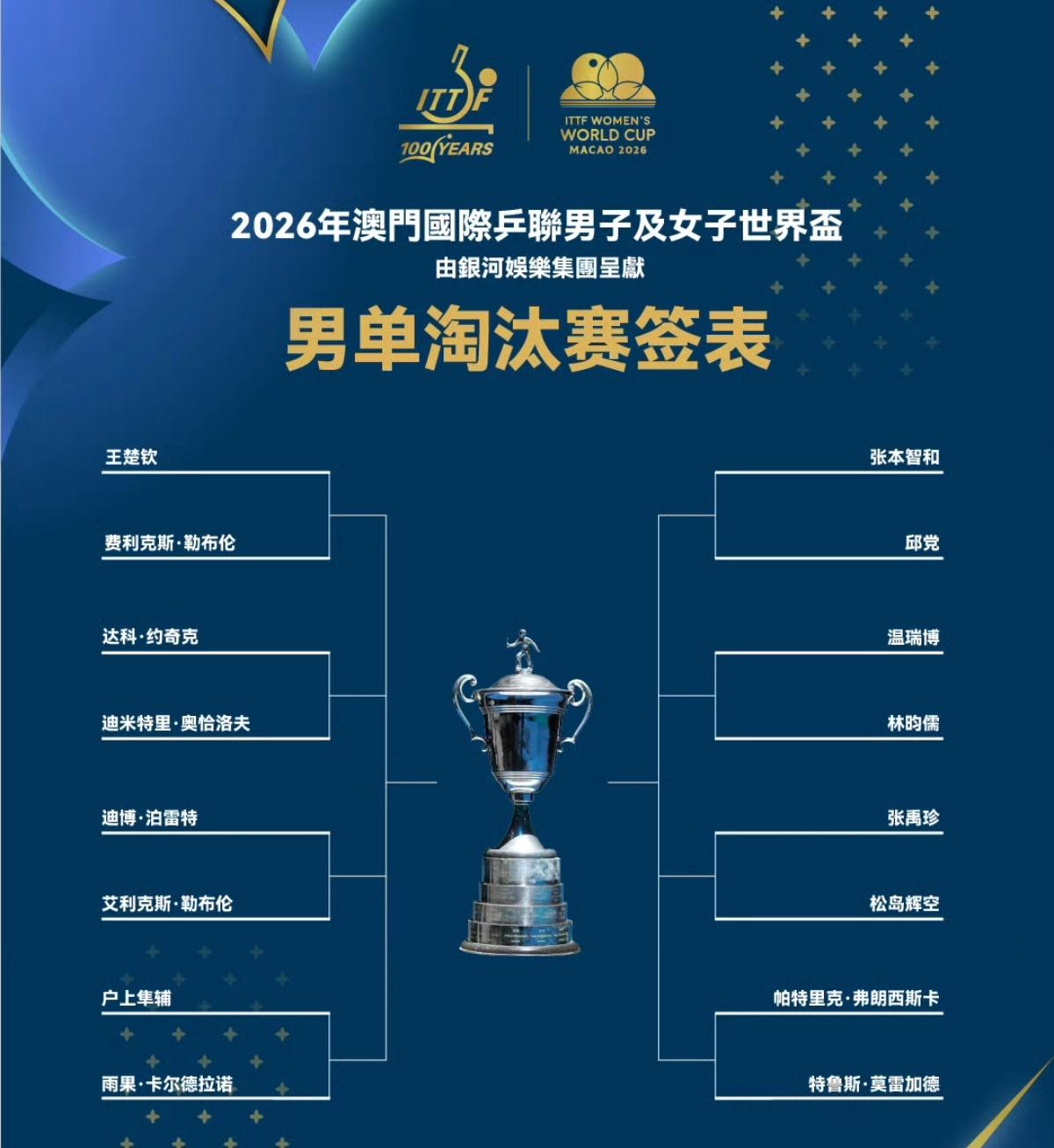 孙颖莎迎战蒯曼,王楚钦迎战f勒布朗,ITTF乒乓球澳门单打世界杯,16强已经全部出炉,随即展开抽签。国乒女单球员将有提前遭遇的情况 本次赛事,国乒女单报名6位球员,全部出线!男单报名5位球员,梁靖崑,陈垣宇和周启豪出局,王楚钦,温瑞博晋级