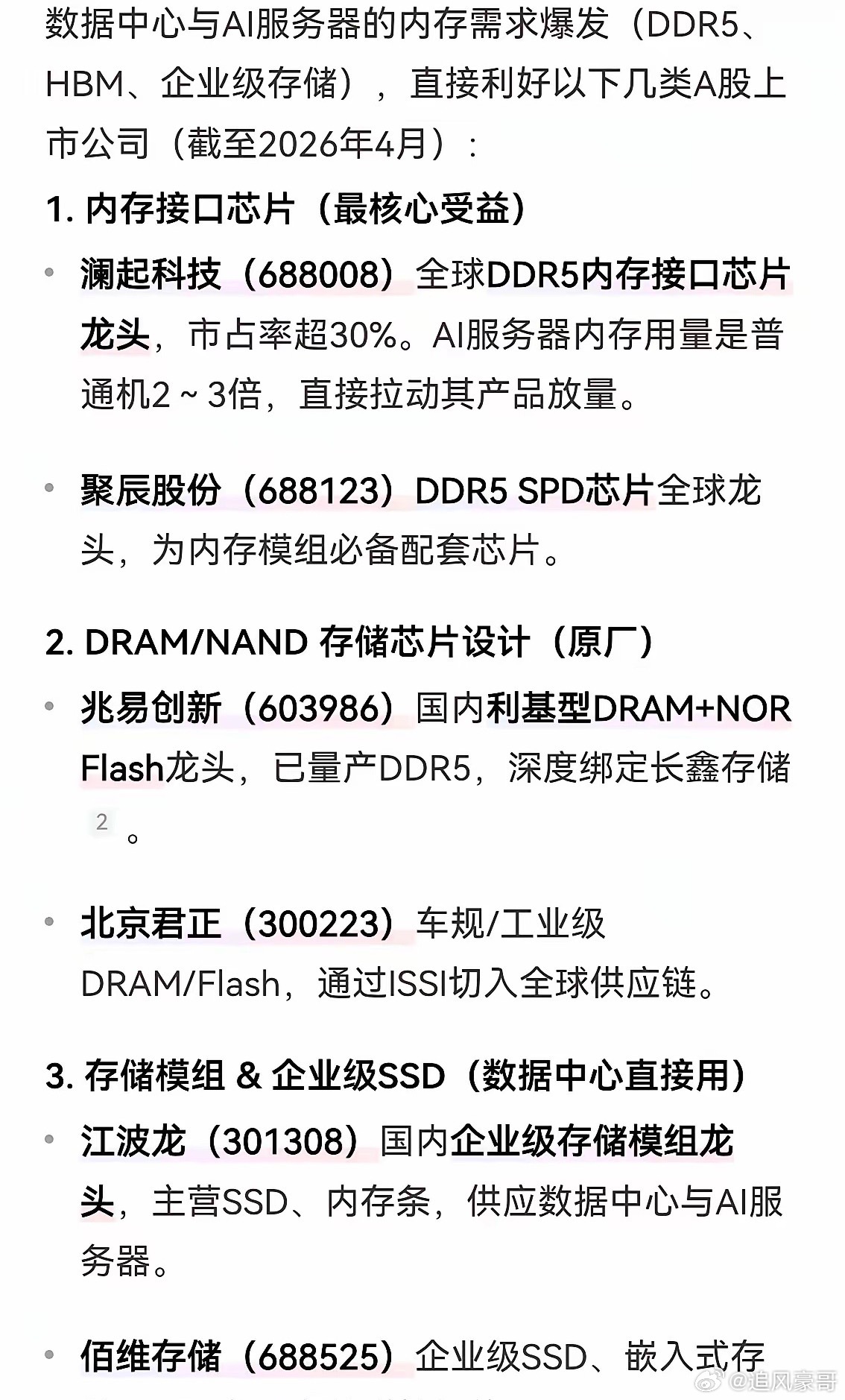 内存将迎来历史性变革!算力即国力,存力即算力,内存将取代GPU,未来内存需求可能高达100万倍!直接受益的龙头公司:第一梯队为内存接口和SPD芯片:1、澜起科技,内存接口芯片世界第一!2、聚辰股份,内存SPD芯片世界第二,中国第一!第二梯队为存储芯片设计:1、兆易创新,DRAM+NORFlash龙头!2、北京君正,DRAM+Flash龙头!第三梯队为存储模组组装:1、江波龙,模组组装龙头!2、佰维,模组组装龙头!