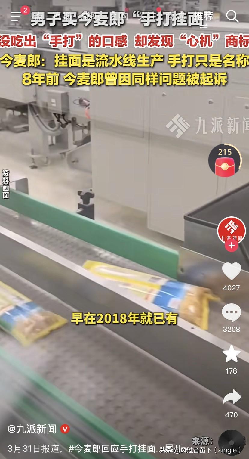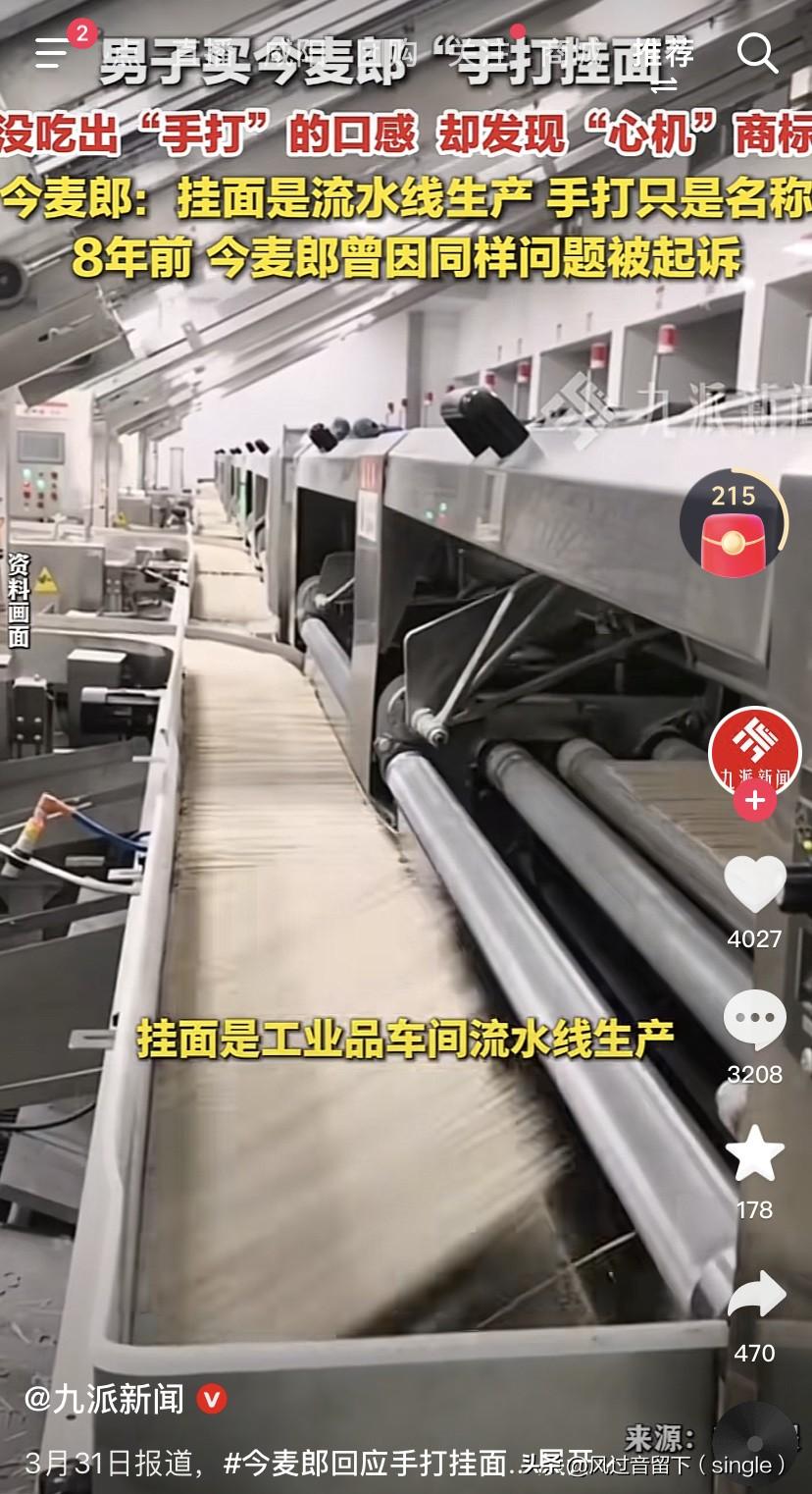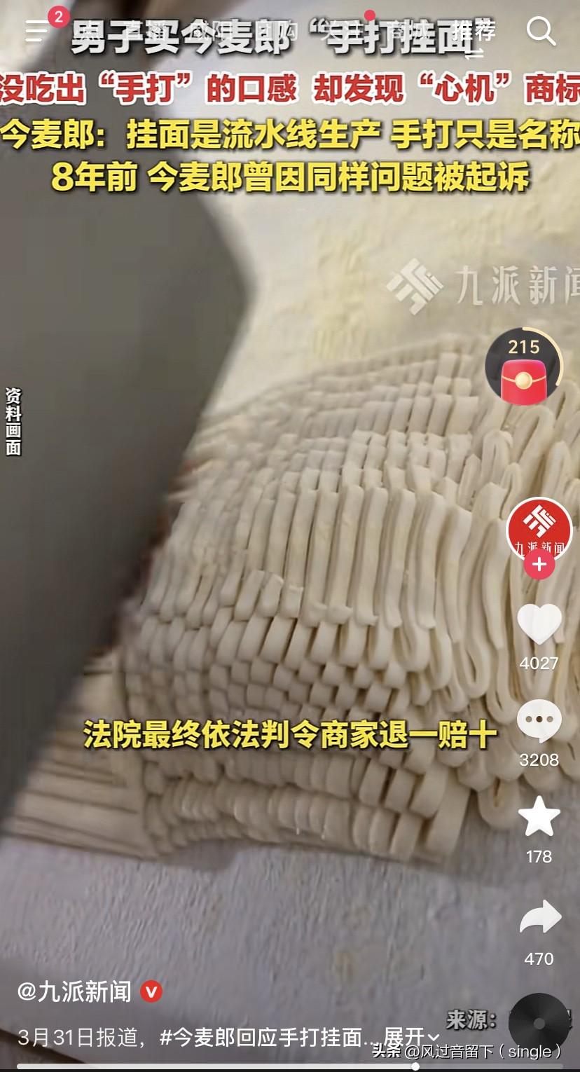 什么妈妈的味道,明明是机器的味道! 3月30日,南京一个男的买了今麦郎手打挂面,回去放到锅里煮面,但是没吃出“手打”的口感,吃出了机器面的感觉。好吧,包装袋下面有小字:好像妈妈的手打面。 今麦郎说挂面就是流水线生产的,手打只是名称。 8年前,就是2018年时候都有了,今麦郎就因为这个问题被起诉,现在又是这样搞,一点都没变过。 法院最后判商家退一赔十,赔了1.1万块钱。 我在想说,手打面,还妈妈的手打面,这机器流水线做出来的哪有妈妈的手打面?妈妈是机器流水线吗? 还有这个今麦郎干的事,商家却受罚,这个有点很不公平啊。 商家只是进货卖货,商家只要保证这个商品没有过期,没有变质就行了,商家才不管这是什么做的。 罚了商家,这对商家是不是很不公平啊?还有今麦郎的解释说“手打”只是商标,都是机器做出来的,是不是存在欺骗消费者的事? 要罚就罚今麦郎,今麦郎这样生产,罚的力度大一点,他今麦郎就知道该咋做了!