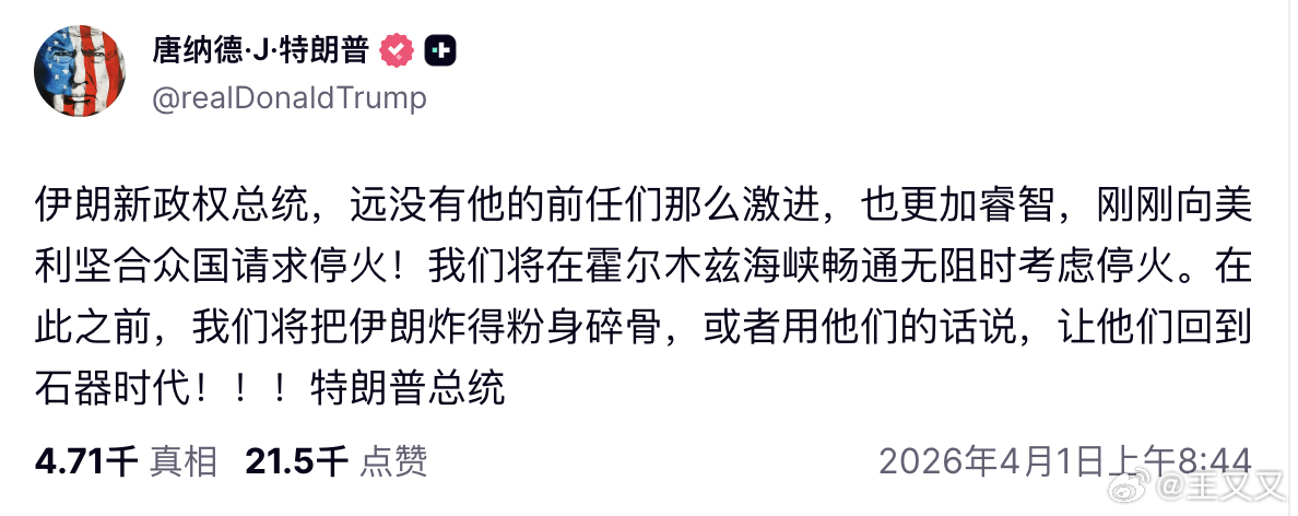 特朗普就退出战争的计划发出了最新信号,称美国只有在霍尔木兹海峡重新开放的情况下才会考虑与伊朗停火。特朗普在truth social发帖称,“伊朗新政权总统刚刚要求美利坚合众国停火!”目前尚不清楚特朗普指的是谁,也没有任何公开迹象表明德黑兰方面已提出停止敌对行动。特朗普称,他将在霍尔木兹海峡“开放、自由、畅通”时考虑这一要求:“在此之前,我们将把伊朗炸得粉身碎骨,或者用他们的话说,让他们回到石器时代!!!”