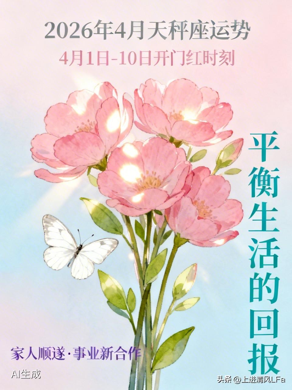 2026年4月,天秤座可有大好事!4月1日到10日,就是“开门红”时刻。这不是凭空掉下来的幸运,是长期平衡生活、默默付出的回报。 一直以来,天秤座特别会过日子,对别人温柔周到,却总对自己苛刻。其实转机早就安排上了。这喜事儿可能藏在日常里,家里等很久的愿望实现,家人顺遂,或者有喜事临门;也可能是人生“跳级”,事业有新合作,生活遇到对的人。 这转机不是偶然,是努力的成果。别纠结喜从何来,带着从容接住就好。4月初,愿天秤座家暖、心安、前路亮。