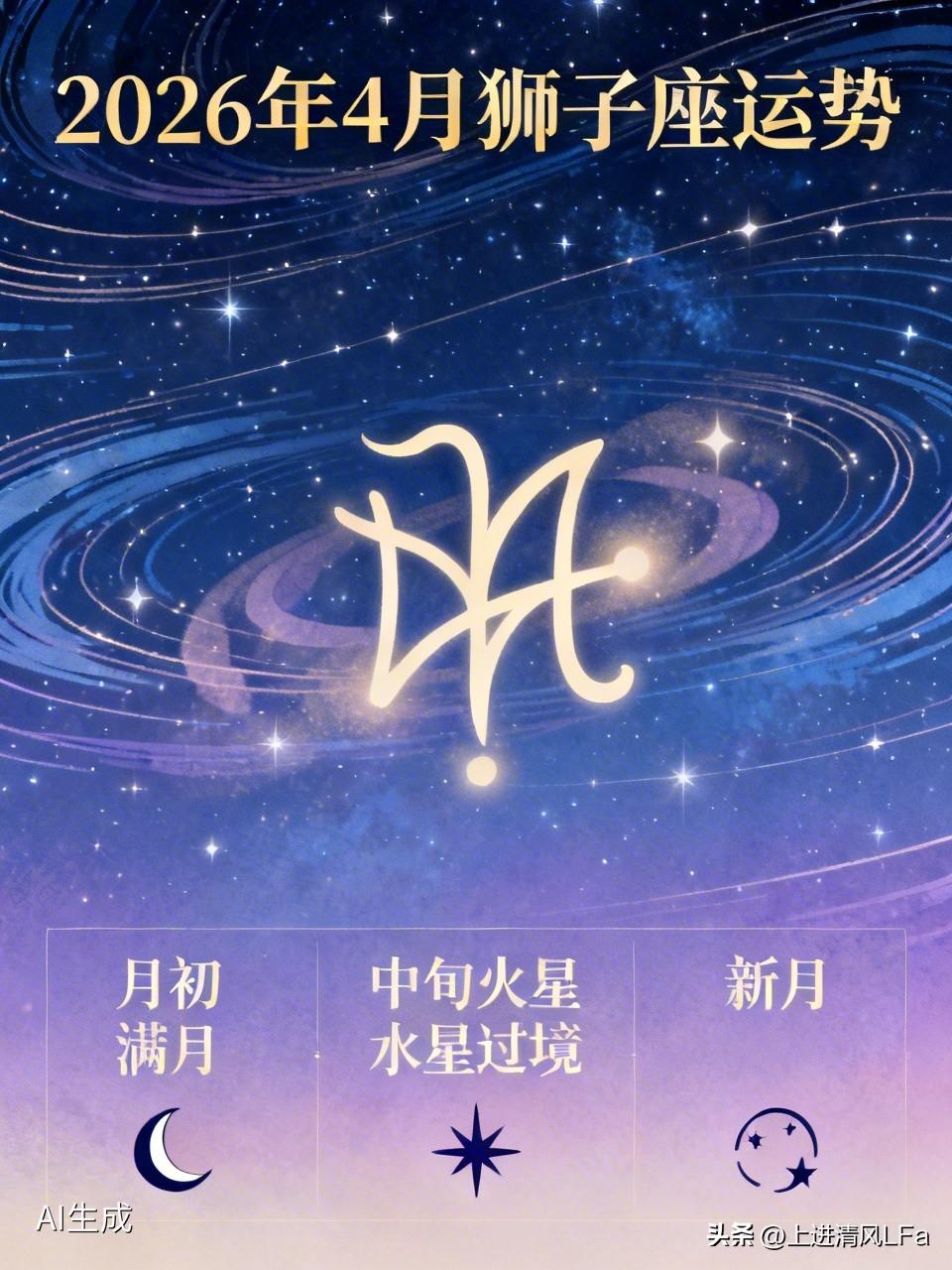 2026年4月,狮子座的运势就像坐过山车。月初满月,任务量激增,会议、出差、培训等一堆事儿,还有文书汇报,面试、考试结果也能见分晓。之后星象不稳,合作方面得留神,合作方可能变卦,合约细则易谈崩,涉及版权、维权等问题得找专业人士。 中旬火星、水星过境,学生党前途光明,利于学习研究、申请奖学金;上班族有自我提升意愿,可能转岗、跨界。从事法律等领域会有新机会。新月时想出去旅行,在沟通、创意工作中灵感迸发,还可能结识贵人。不过海王星会让人忽略细节、容易分心。20日左右还有状况,得时刻留意。