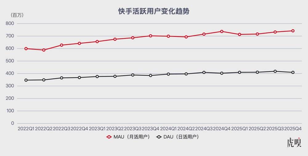 更糟的是季度数据的环比下滑:2025年四个季度,快手日活分别为4.08亿、4.09亿、4.16亿、4.08亿,受暑期流量红利消退等多重因素叠加,四季度较三季度环比流失800万用户;月活同比增速更骤降至0.7%,创下2021年上市以来历史最低值。