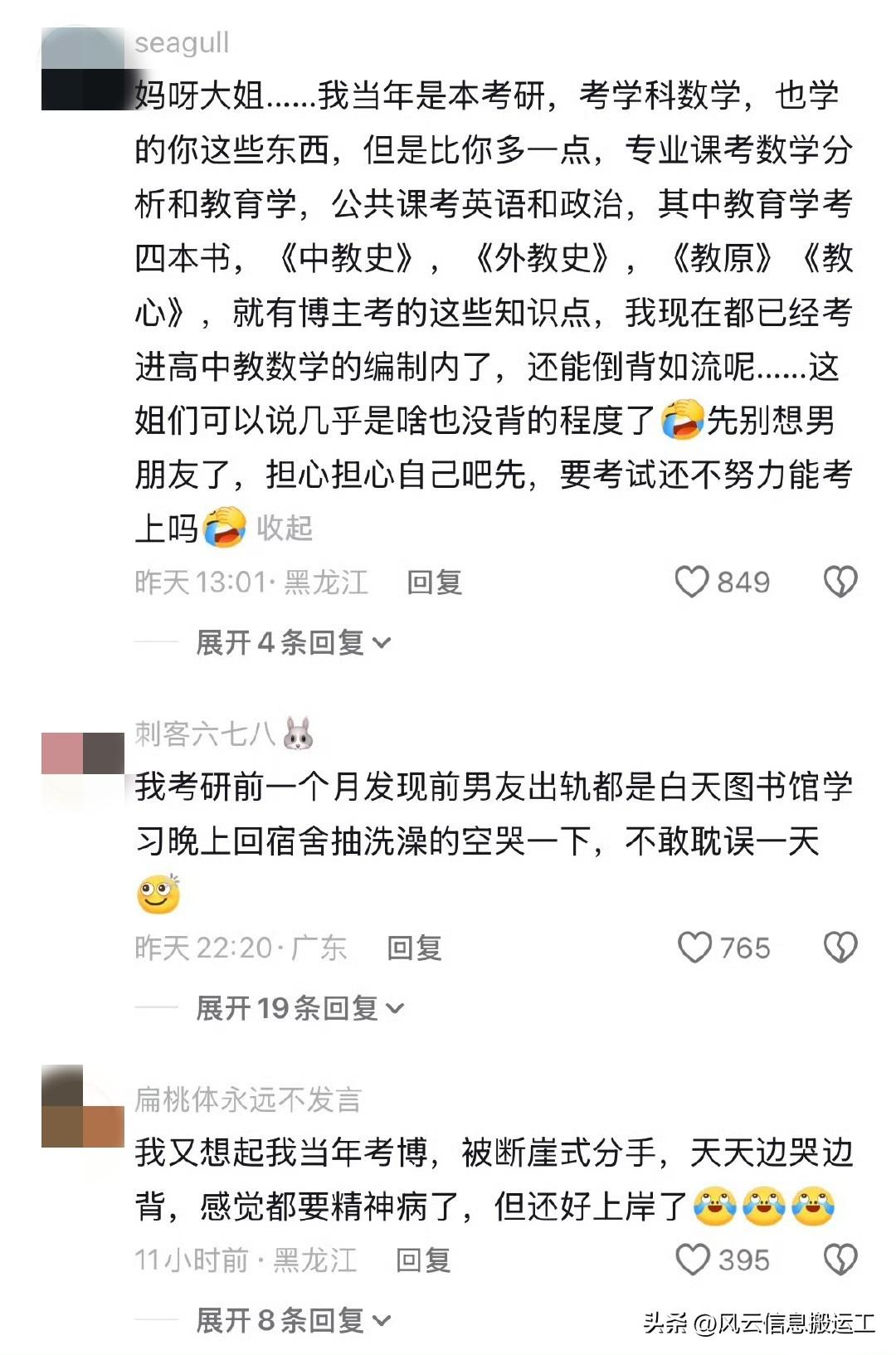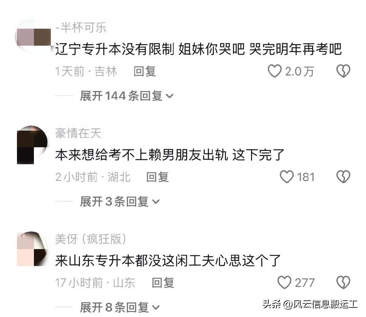 一个女生找一个博主连线诉求一下,原因是4月11号就要考试了(专升本)还因为恋爱这事而哭泣 博主受不了了,当场考了她几道题(巧的是博主跟她一个专业的都是教育学都是专升本)所以精准的拷问她,她就在那一边哭一边哼哼说一些最简单的还说错了 博主说你这都不会还好意思上考场呢?你还哭呢?你还好意思为男的哭呢?这都马上考试了必考的你都不知道,就这样你还为男的哭呢?你专升本的话这都不知道你多余去考场了不抵在家睡觉呢!为你未来哭吧,你想让谁同情你?! 而且还花一万块钱报了提高班,还租了 10 个月房子,还找父母要生活费,三万块钱花出去了屁也没学会 第一条这个评论说的太好了,一针见血,有些人哼哼唧唧的可未必是恋爱脑了还是咋了,纯是马上上战场了知道自己没本事提前在这给大家做铺垫呢 说因为爱情耽误前途了,比单纯是个又懒又笨的人听起来体面,纯一个甩锅找借口的,如果这大半年用心看书读书了也不会连最基本都不会!