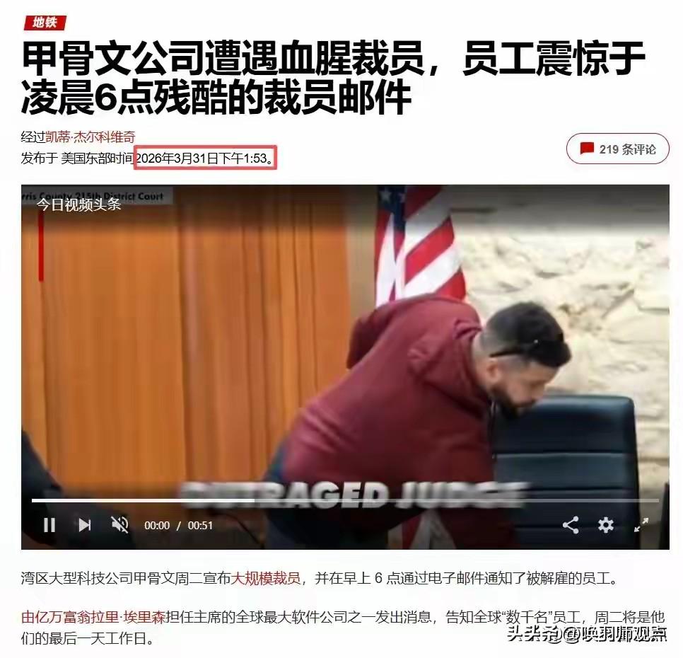 互联网公司裁员的原因是什么? 凌晨6点,甲骨文向3万名员工发送裁员邮件,波及工程、云服务等核心部门。选在月底周一凌晨,连最后一周薪资都被“精算”。而公司财务状况良好:2026财年预计增长15%,云营收增长49%,创始人刚登顶世界首富。赚钱的公司为何疯狂裁员?答案:AI赌局。 专家解读: 商业分析师指出,甲骨文在投行建议下砍人省现金流,每年可省80-100亿美元,全部砸向AI基础设施——建数据中心、抢GPU。这是全球科技巨头“砍人、借钱、堆算力”三部曲的缩影:英特尔裁2.5万、亚马逊裁1.6万、微软裁近1万……投资者用脚投票,甲骨文股价腰斩。 残酷真相: 在公司眼里,人是可优化的成本。3万人的职业生涯,在投行研报里就是“80亿美元”。最讽刺的是,被裁的很多人就是做AI基础工作的——亲手养大AI,然后被AI替代。公司是家?真相是:你只是零件。 唤羽师结语: 3万人的饭碗,换一张AI入场券。技术进步的代价,不该总是由打工人来支付。 --- 对此,你怎么看?你认为AI浪潮下,普通人该如何保住自己的饭碗?欢迎在评论区留下你的观点。互联网行业为啥大量裁员? 互联网企业未来的走向如何? 互联网企业裁员有几种说法?