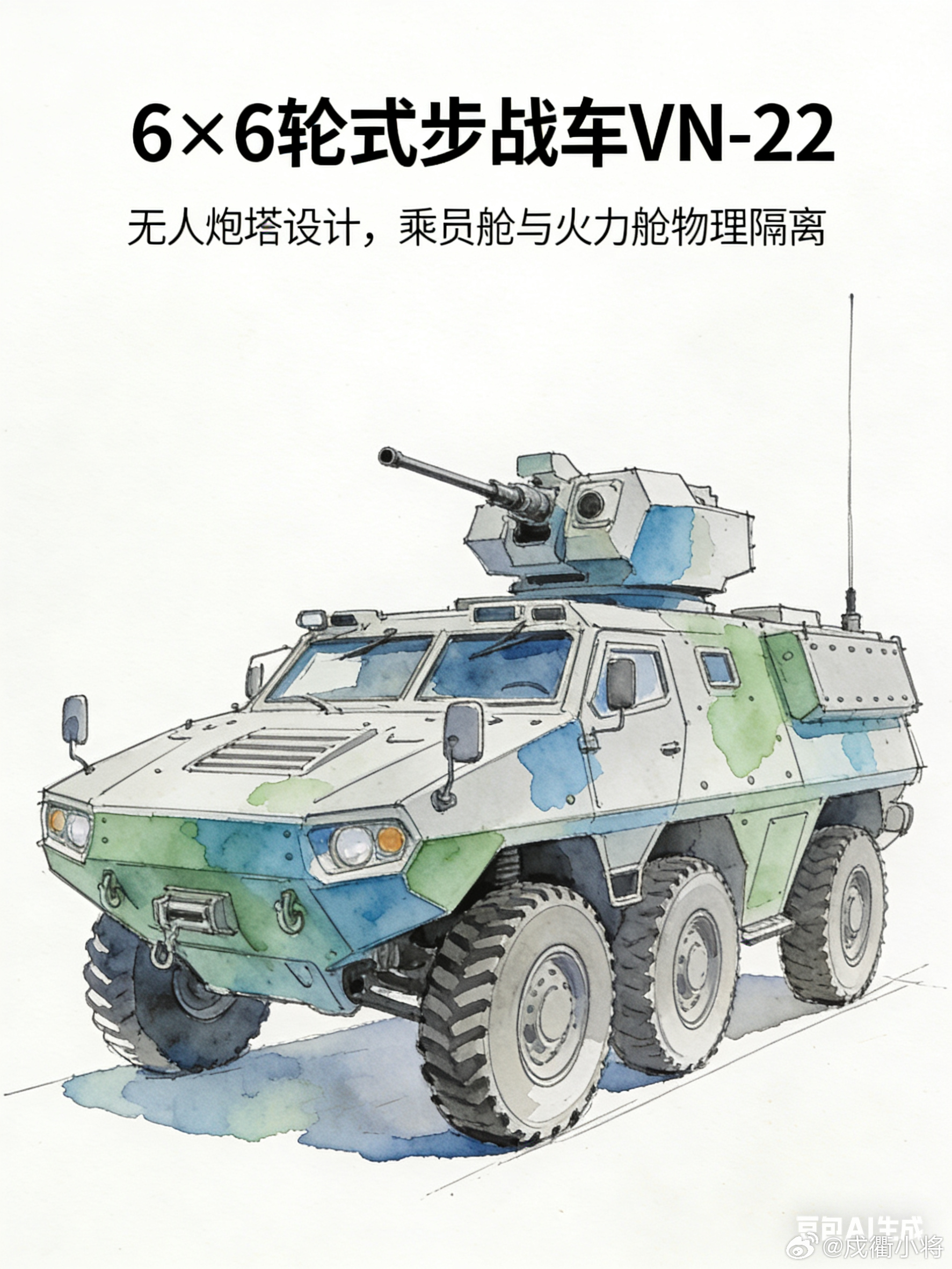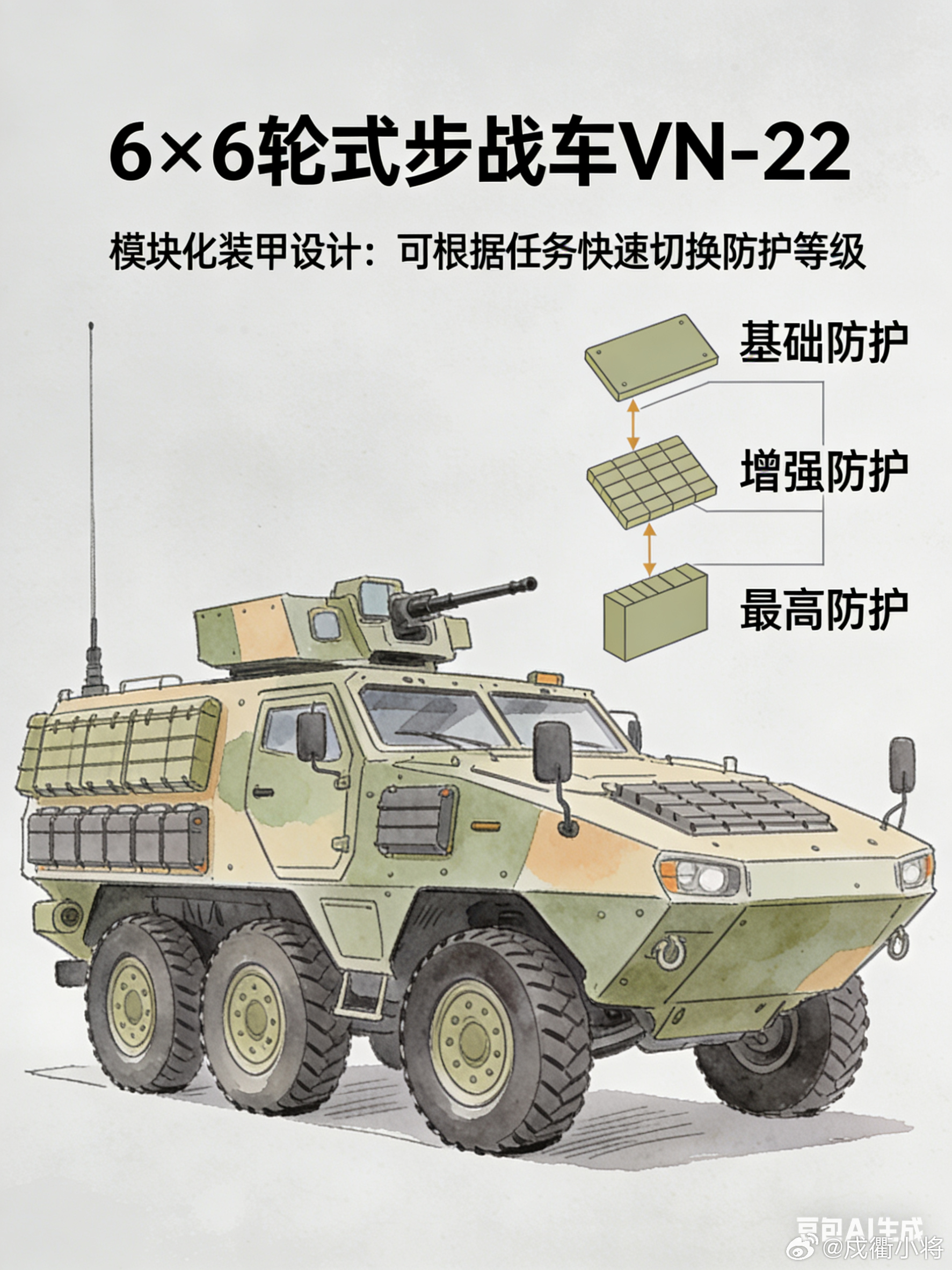 伊拉克版VN-22绰号“魔鬼之石”,是2024年伊拉克依托中国北方工业技术,在本土巴格达Al-Rabie工厂许可生产的重型轮式装甲装备,也是2003年后伊拉克首款国产重型装甲车,由伊拉克国防工业委员会主导生产,主要替代老旧BMP系列步战车,成为陆军、反恐及边境巡逻部队的主力装备。该车为6×6轮式步战车,战斗全重约25吨,搭载800马力涡轮增压柴油发动机,公路最大时速110公里,可搭载3名操作人员与8名步兵,机动性能适配伊拉克沙漠作战环境,能快速执行机动作战任务。其防护能力突出,达到北约STANAG 4569四级防护标准,车身全向抵御14.5mm穿甲弹,正面可抗25mm机关炮射击,V形底盘能承受10kg TNT当量地雷爆炸,载员舱配悬空防雷座椅,高配版还搭载GL6主动防护系统,可拦截火箭弹与导弹,适配境内反恐防爆需求。武器配置做了本土化调整,搭载伊拉克自产Al-Bark三管12.7mm加特林机枪(CS/LM5仿制版),射速可调,辅以烟雾弹发射器,侧重近距离火力压制与巡逻作战。车体采用无侧窗、360°摄像头设计,尾部液压坡道方便步兵快速上下,沙漠黄涂装也契合当地地形,是伊拉克军工自主化的重要标志。军事ai新视野ai创造营