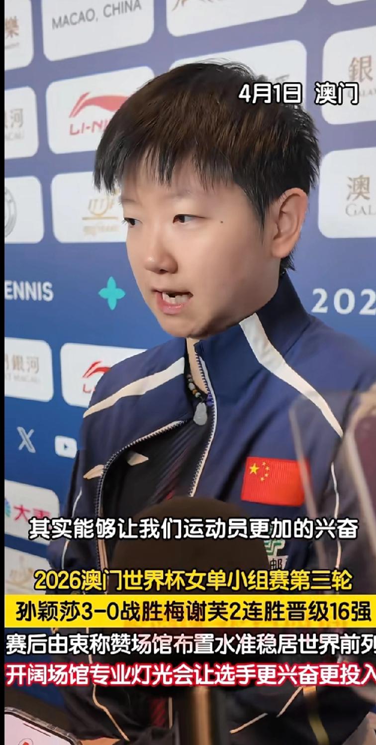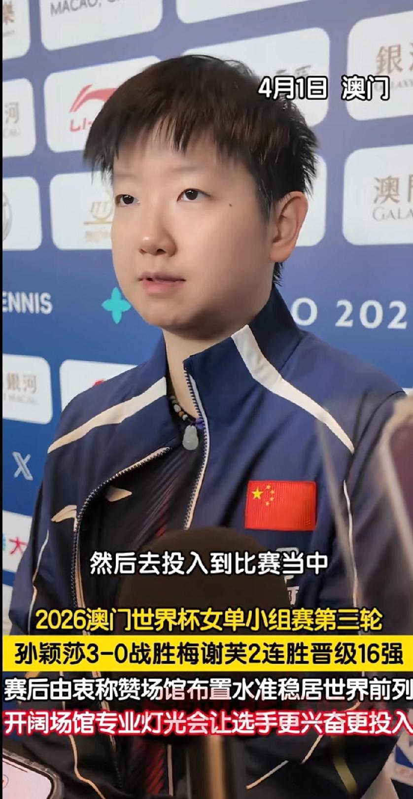 孙颖莎3-0横扫晋级16强!盛赞澳门赛场:顶级灯光让选手越打越兴奋 4月1日