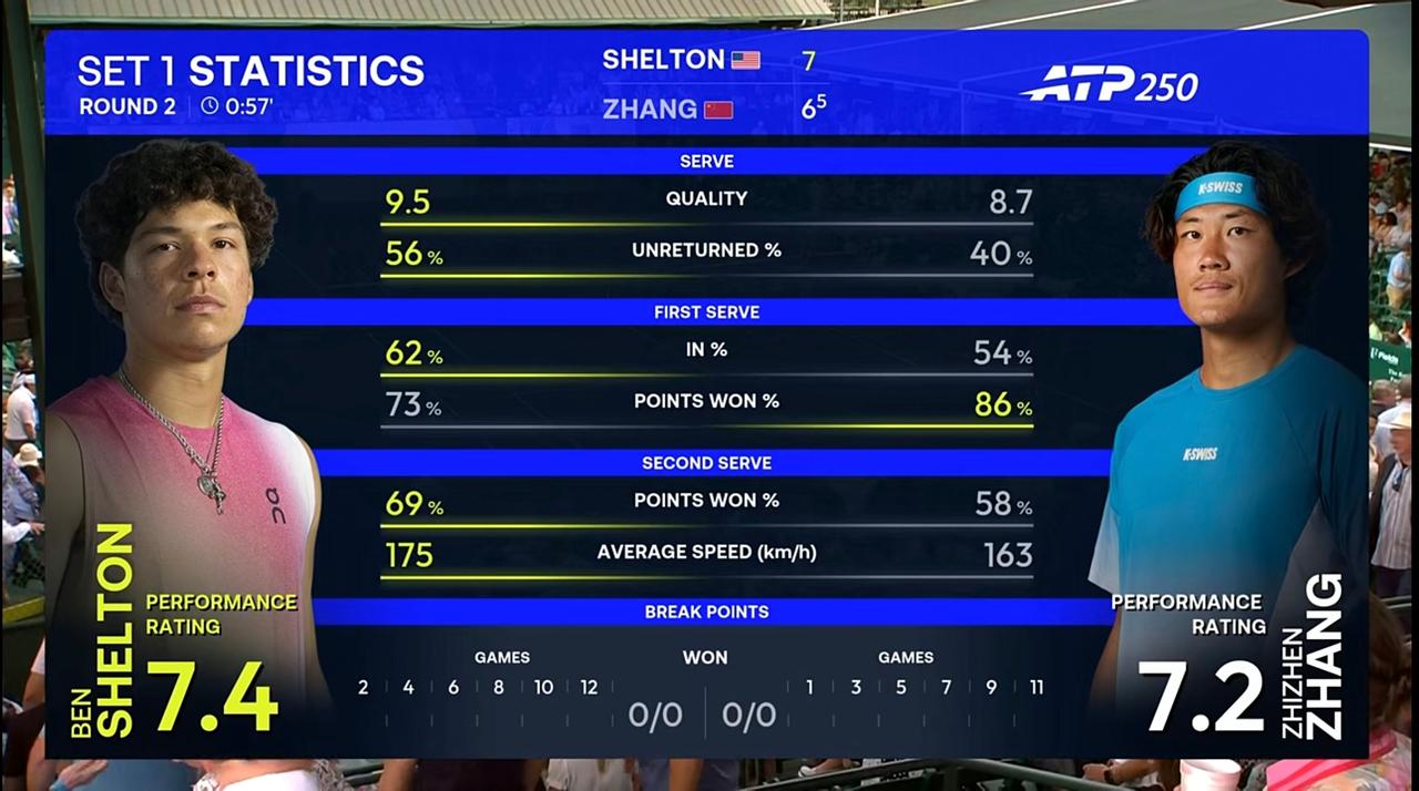张之臻ATP250休斯敦站第二轮一发得分率84.62%,抢七痛失领先优势,遗憾丢掉首盘 北京时间2026年4月2日早上,ATP250休斯敦站第二轮,中国选手张之臻对阵美国名将谢尔顿。 第一盘,前九局各自保发,且未出现一个破发点。第十局,张之臻非保不可发球局,结果仅丟一分,顺利保发,5:5。第十二局,张之臻再次迎来非保不可发球局,在握有连续三个局点的情况下发出双误,最终仅丟一分,成功保发。6:6。 抢七,4:2,张之臻领先交换场地,在5:2领先的情况下被连追4分,送出一个盘点,最终被谢尔顿连拿五分,遗憾丢掉抢七局。7:5。 7/6(5),谢尔顿拔得头筹。 整盘比赛,张之臻共轰出7记ACE比谢尔顿少3记,一发得分率高达84.62,比谢尔顿高出11个多百分点。 张之臻整盘比赛可圈可点,但关键时刻掉链子,十分可惜。[捂脸][捂脸][捂脸][捂脸][捂脸][呲牙][呲牙][呲牙][呲牙][呲牙][呲牙]