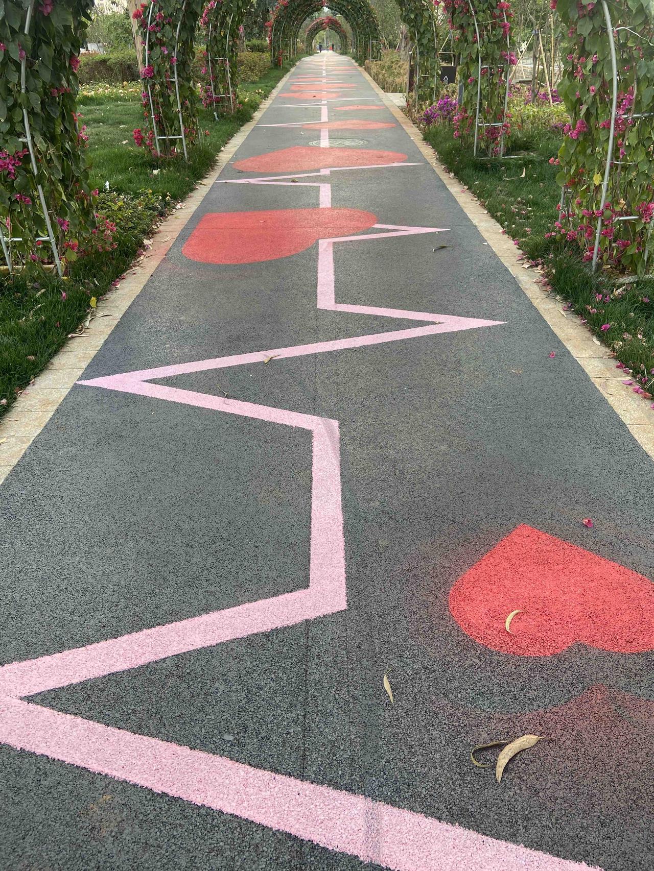 散步的时候,本来公园花廊下面水泥地上画心跳图形,觉得很有创意,结果又给画上了红色的爱心,把心跳的意思给明确了出来,就觉得很没意思。 水泥地上一个个红色的爱心,与红色的三角梅给呼应上了,再用心跳的图形,让爱心动起来,似乎意思很明显。但这个红色的爱心多了以后,就会让人感觉很杂乱,好像一个心跳要配那么多的爱心,它是对应不起来的。 花廊前后都用绳子拦住人不让走,要等颜色在水泥地上固定了。