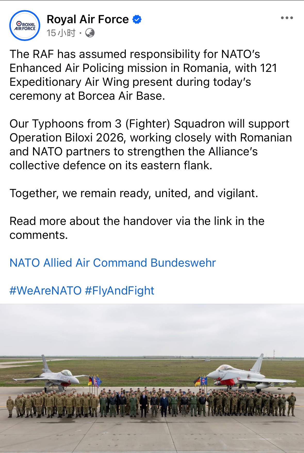 今日台风 英国台风接替德国台风(网页链接)承担“黑海空中警巡”任务军用飞机信息汇今日战隼 英国皇家空军(RAF)公开确认台风来自第3战斗机中队,部署的基地是罗马尼亚空军第86基地(费泰什蒂 Fetești)。 这就对了嘛,你不公开披露我也能看出来(网页链接)。Photo credit: RAF
