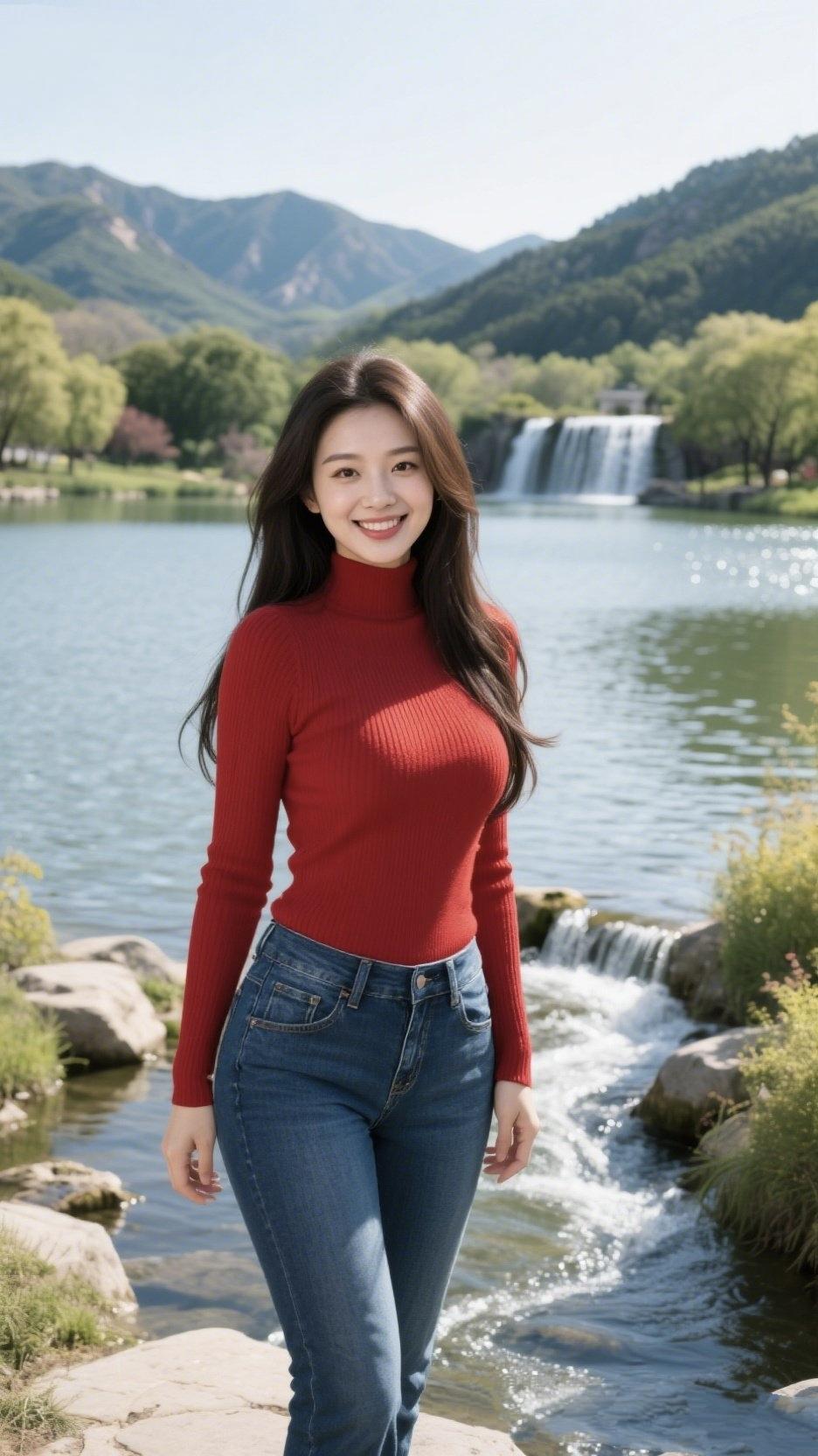《晴川红衣》 晴光漫过山峦的轮廓, 风把春的信笺,铺在粼粼的波。 一瀑清欢悬在远岸,碎成银箔, 漫入平湖,漾开满湖的澄澈。 你立在溪石旁,红衣似火, 撞碎了青山的黛色,点亮了水的柔波。 高领的针织裹着春的温热, 牛仔裤的蓝,衬出山野的辽阔。 长发被风轻轻撩拨, 笑靥里盛着,比春光更暖的色泽。 溪涧的细流,在脚边叮咚唱和, 远山含翠,为你铺开千里的画轴。 柳色新新,染透了堤岸的坡, 松涛隐隐,漫过了层叠的壑。 一帧帧,是人间最鲜活的春色, 一抹红,是岁月最明媚的烟火。 不必寻诗,你便是诗的魂魄, 不必寻景,你便是景的脉络。 在山水之间,在晴光之下, 把寻常日子,活成了最动人的歌。 红衣清韵 红衣映山花 红衣温柔 红衣花韵 雾境红衣佳人 红衣照 江畔红衣影