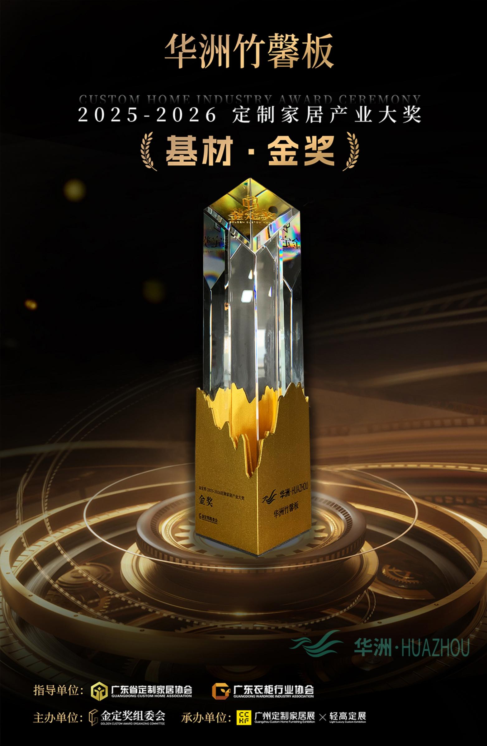 3月30日,2025-2026金定奖・定制家居产业大奖在广州圆满落幕。这场汇聚950余家企业、历经数月严苛评审的行业盛事,最终诞生了本届最耀眼的赢家——华洲木业。凭借旗下竹馨板斩获基材类金奖,叠加此前金品澳桉板已获金定奖板材金奖,华洲成为实现双金加冕的板材品牌,以绝对实力领跑高端环保基材赛道。