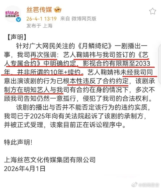 丝芭起诉月鳞绮纪承制方!丝芭坚持鞠婧祎影视合约到2033年到期,声明强调,鞠婧祎违反合约出演该剧,《月鳞绮纪》承制方明知鞠婧祎影视合约在丝芭,依旧不顾警告找鞠婧祎拍摄属于侵权,已经把承制方告了,也就是说鞠婧祎已经拍完的《来战》,以及将开机的《万花世界》,到时候应该也会出问题,只要鞠婧祎不给丝芭分钱,丝芭依旧会出来闹,即便到了2033年,只要给丝芭的钱没分够,双方官司也依旧会打下去。