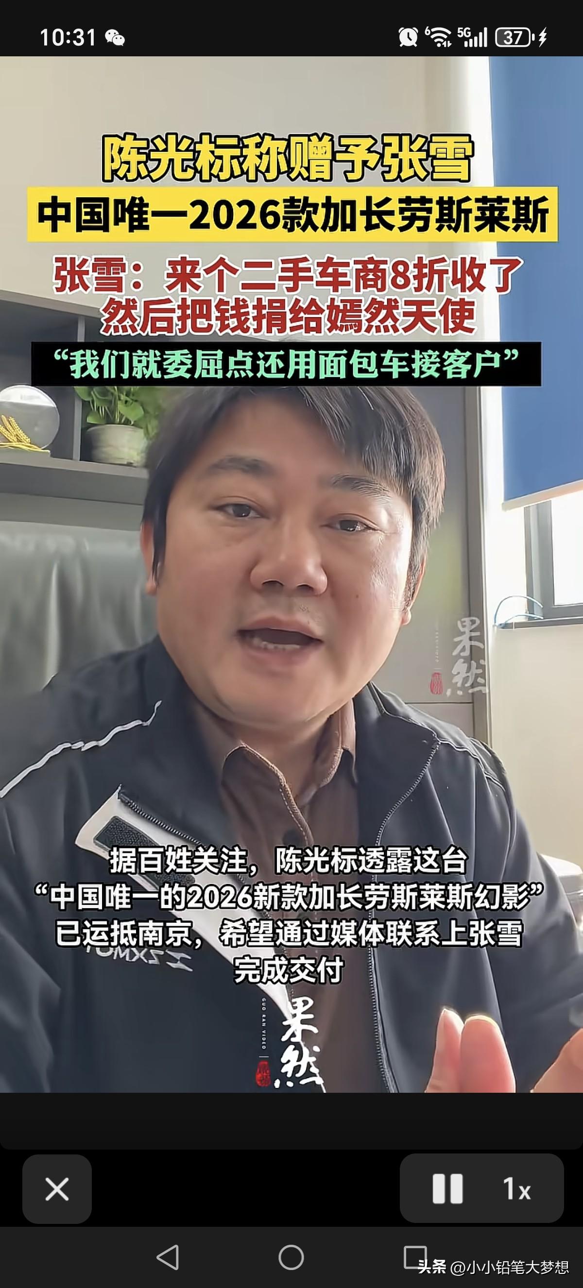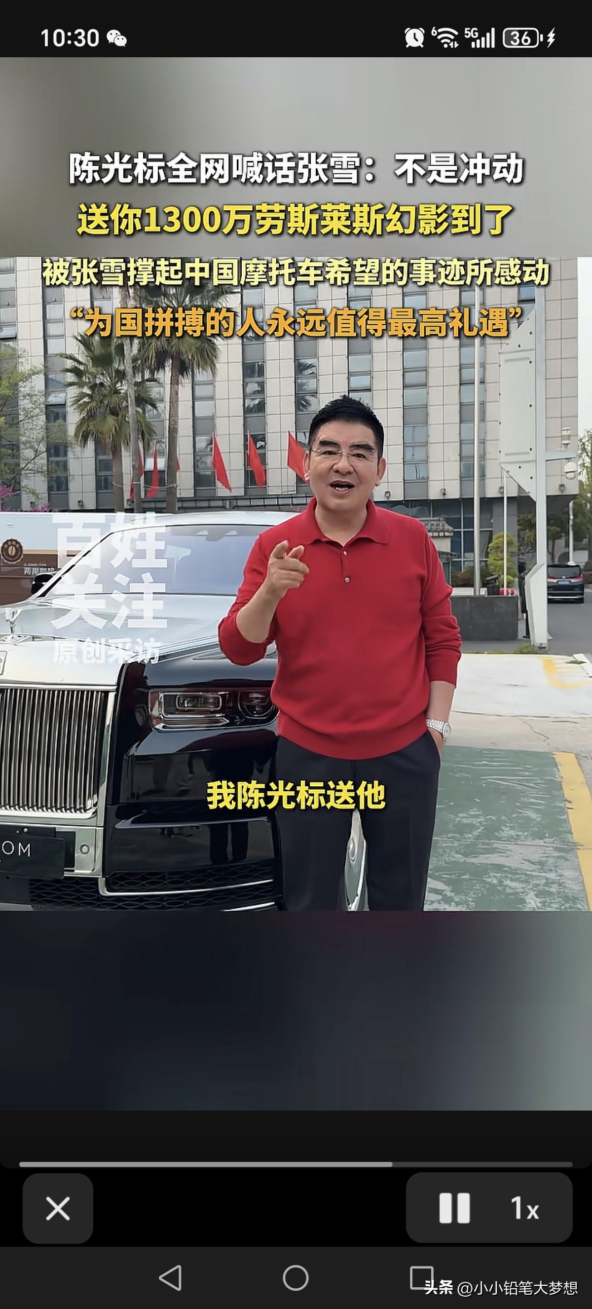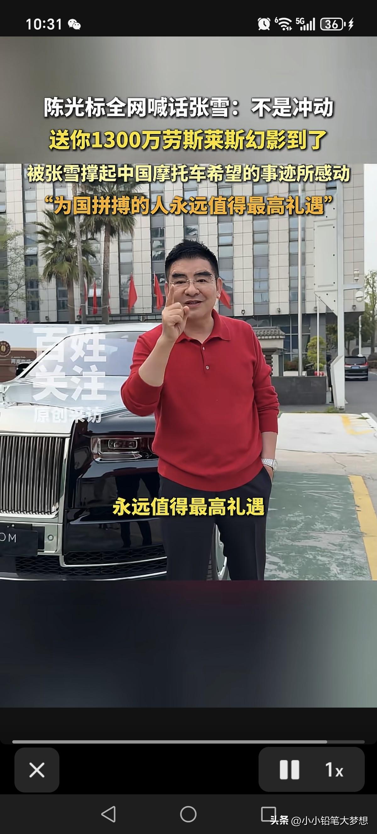 这下啪啪打脸啦!慈善家陈光标将全国唯一一台价值1300万的劳斯莱斯新款幻影赠给张雪,张雪对此事做出回应:“来个二手车商八折收了,然后把这个钱捐给嫣然天使,我们就委屈点还用面包车接客户!” 4月1日,慈善家陈光标发视频称,要将中国唯一一台2026加长新款的价值1300万的劳斯莱斯赠送给张雪,这台车已经运送到南京,就等着跟张雪对接交付,他希望相关的媒体帮忙通知张雪本人。 陈光标还解释自己这么做是因为张雪在3月28号到3月29号世界超级摩托车锦标赛葡萄牙站夺了两回冠军,张雪从一无所有撑起了中国摩托车的希望,他为国争光了,为中国赢得了荣誉就该重奖,所以他值得,而且陈光标说自己这样的举动并不是冲动,是真心实意的。 张雪这个事情之后就在自己的社交号上立马回应:“来个二手车商八折收了,然后把这个钱捐给嫣然天使,我们就委屈点还用面包车接客户!” 这回应绝了,本来这样的车就是显摆,并没有实际意义,又费油,这保养得花多少钱?他本来就是个实干的人,这些虚头巴脑的东西,他还真用不上,正常的人真正要送人的都是送实际的东西,而且如果真送就送到人家的手上,而不是让人去你那提,而且还让媒体去通知他。 张雪总看透了陈光标,这世界这世界没有无缘无故的爱,不得不感叹呐张雪情商真的高,知道陈光标是来蹭热度,也知道他之前说过捐助嫣然基金要王菲来开演唱会为条件…… 所以他一个反手操作折现吧,把这个钱捐给嫣然基金,这操作简直堪称完美啊!这也算一个爱心的接力了吧!