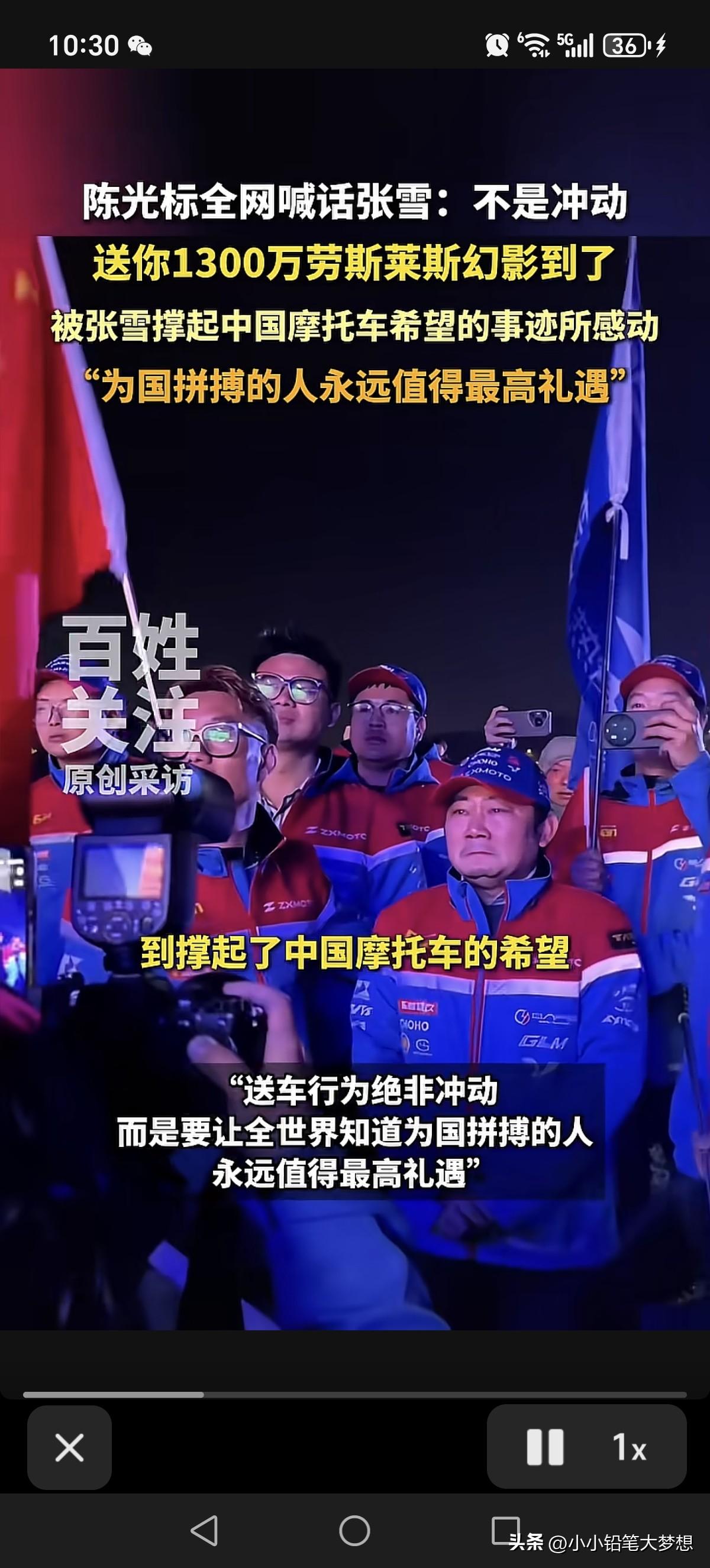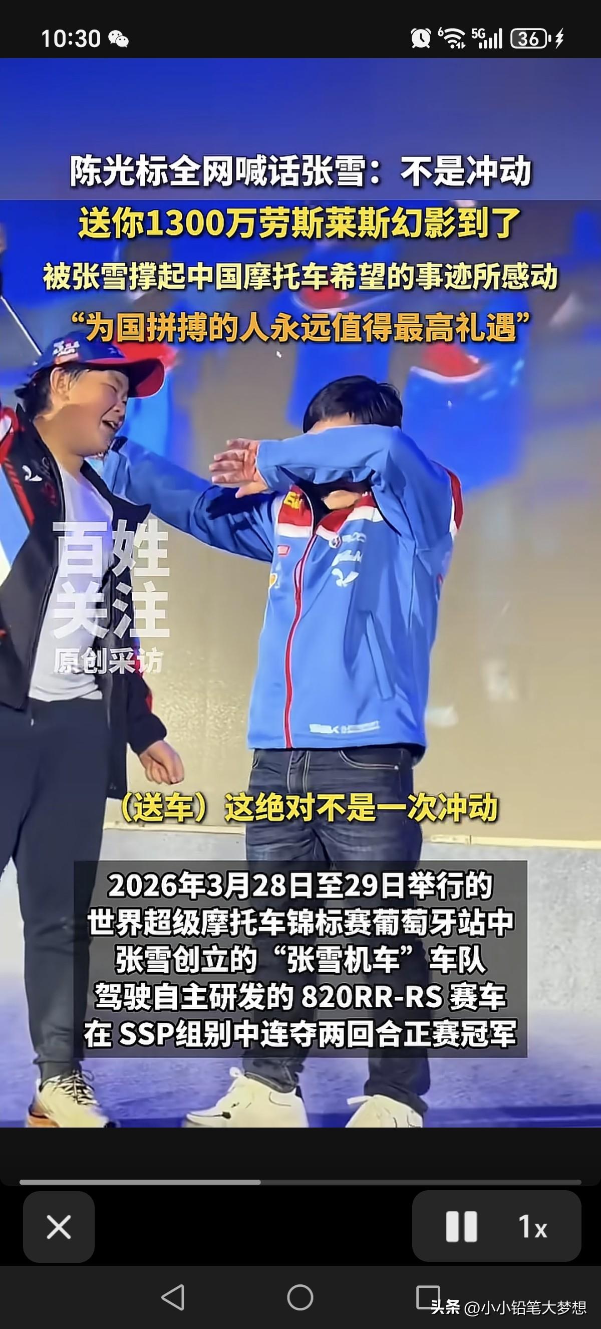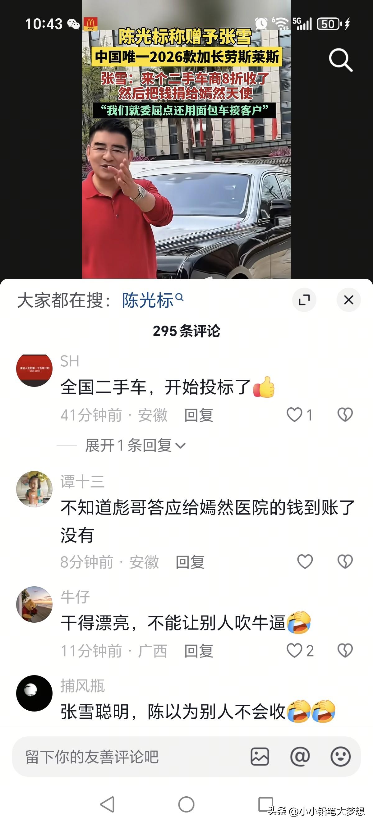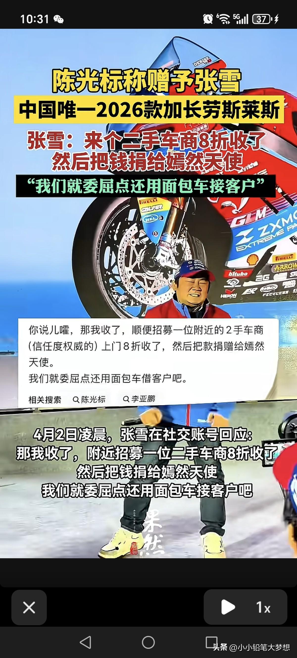 这下啪啪打脸啦!慈善家陈光标将全国唯一一台价值1300万的劳斯莱斯新款幻影赠给张雪,张雪对此事做出回应:“来个二手车商八折收了,然后把这个钱捐给嫣然天使,我们就委屈点还用面包车接客户!” 4月1日,慈善家陈光标发视频称,要将中国唯一一台2026加长新款的价值1300万的劳斯莱斯赠送给张雪,这台车已经运送到南京,就等着跟张雪对接交付,他希望相关的媒体帮忙通知张雪本人。 陈光标还解释自己这么做是因为张雪在3月28号到3月29号世界超级摩托车锦标赛葡萄牙站夺了两回冠军,张雪从一无所有撑起了中国摩托车的希望,他为国争光了,为中国赢得了荣誉就该重奖,所以他值得,而且陈光标说自己这样的举动并不是冲动,是真心实意的。 张雪这个事情之后就在自己的社交号上立马回应:“来个二手车商八折收了,然后把这个钱捐给嫣然天使,我们就委屈点还用面包车接客户!” 这回应绝了,本来这样的车就是显摆,并没有实际意义,又费油,这保养得花多少钱?他本来就是个实干的人,这些虚头巴脑的东西,他还真用不上,正常的人真正要送人的都是送实际的东西,而且如果真送就送到人家的手上,而不是让人去你那提,而且还让媒体去通知他。 张雪总看透了陈光标,这世界这世界没有无缘无故的爱,不得不感叹呐张雪情商真的高,知道陈光标是来蹭热度,也知道他之前说过捐助嫣然基金要王菲来开演唱会为条件…… 所以他一个反手操作折现吧,把这个钱捐给嫣然基金,这操作简直堪称完美啊!这也算一个爱心的接力了吧!