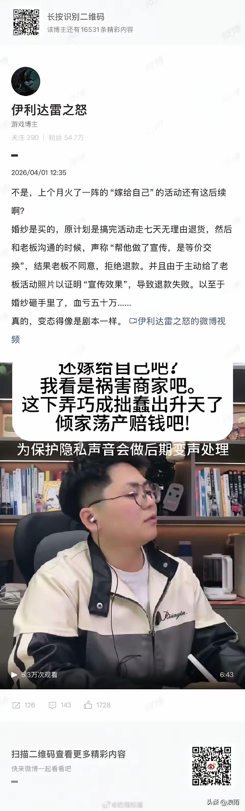 破防了。一群80后“小姐姐”参加“嫁给自己”活动,组织者向她们收钱说统一帮她们买婚纱,承诺事后婚纱可以7天无理由退货。 大家一想这样既不用花钱,又体验了一把穿婚纱和自己结婚的感觉,不吃亏,不上当。 已是不在乎价格的她们纷纷选了自己喜欢的婚纱,一群人买婚纱一共花费了50万左右。 没想到活动结束后,操作没有成功,商家拒绝给她们退货退款。 这下姐姐们不乐意了,没想到嫁给自己最后还得为婚纱买单,她们纷纷向组织者讨要婚纱钱。