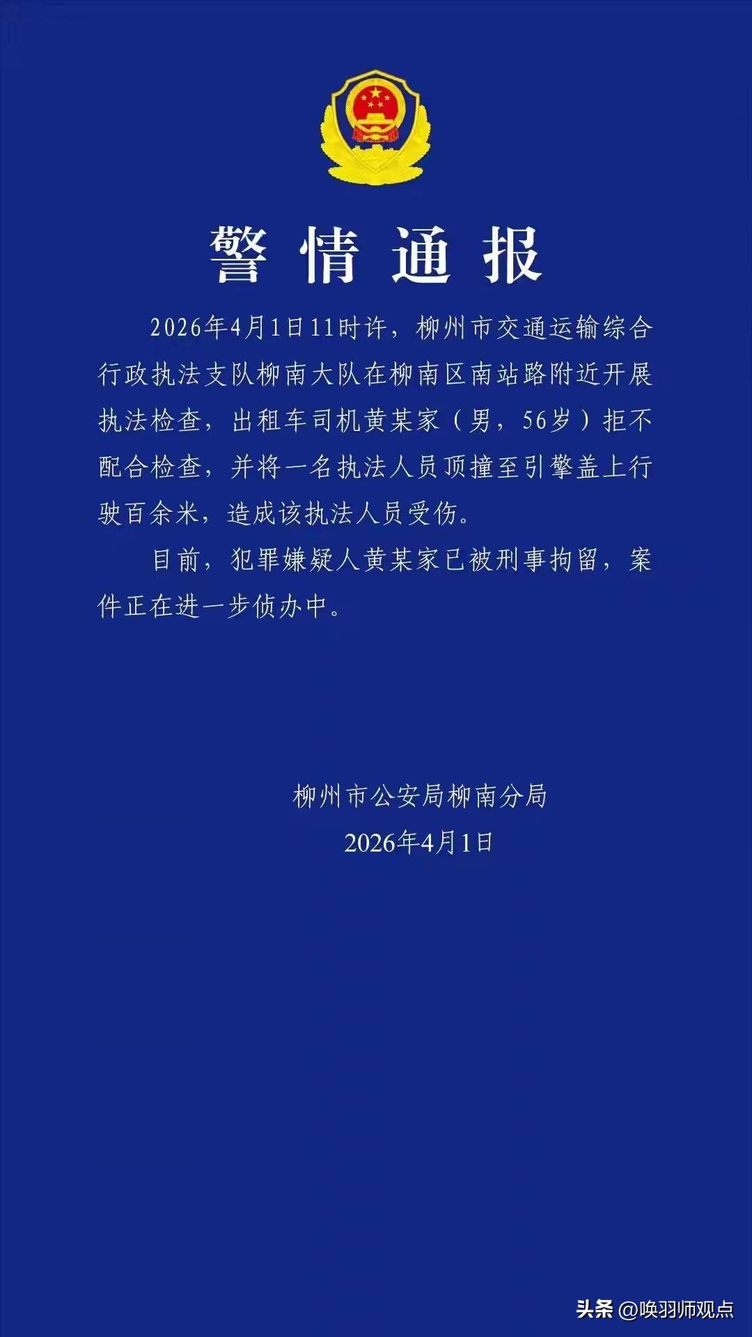 出租车司机顶行执法人员百余米被刑拘!网友:太疯狂 近日,柳州发生一起惊险事件:一名出租车司机在遇到执法检查时拒不配合,竟将执法人员顶在引擎盖上行驶百余米,致其受伤。警方通报称,涉事司机黄某家已被刑事拘留。 法律专家指出,该行为已涉嫌妨害公务罪,将面临刑事责任。心理学专家分析,司机或因长期压力导致情绪失控。事件引发广泛讨论,有人谴责暴力抗法,也有人反思执法方式。 唤羽师观点: 冲动是魔鬼,暴力抗法终将自食恶果。执法人员需文明规范,从业者也要尊法守法。法治社会,任何一方都不能任性。唯有相互理解与尊重,才能避免类似悲剧重演。 您觉得这类事件该如何避免?是加强执法培训,还是提高从业者法治意识?评论区等您的高见!司机处罚规则 海口司机被打 无证拦车 导游处罚 南宁出租车事故 出租车跨城罚款 柳州坠江司机 高空车作业人员 司机行为规范 北海出租车超载 出租车执法 柳州出租车坠河 摩的司机打人 武汉坠江司机 清远坠江司机