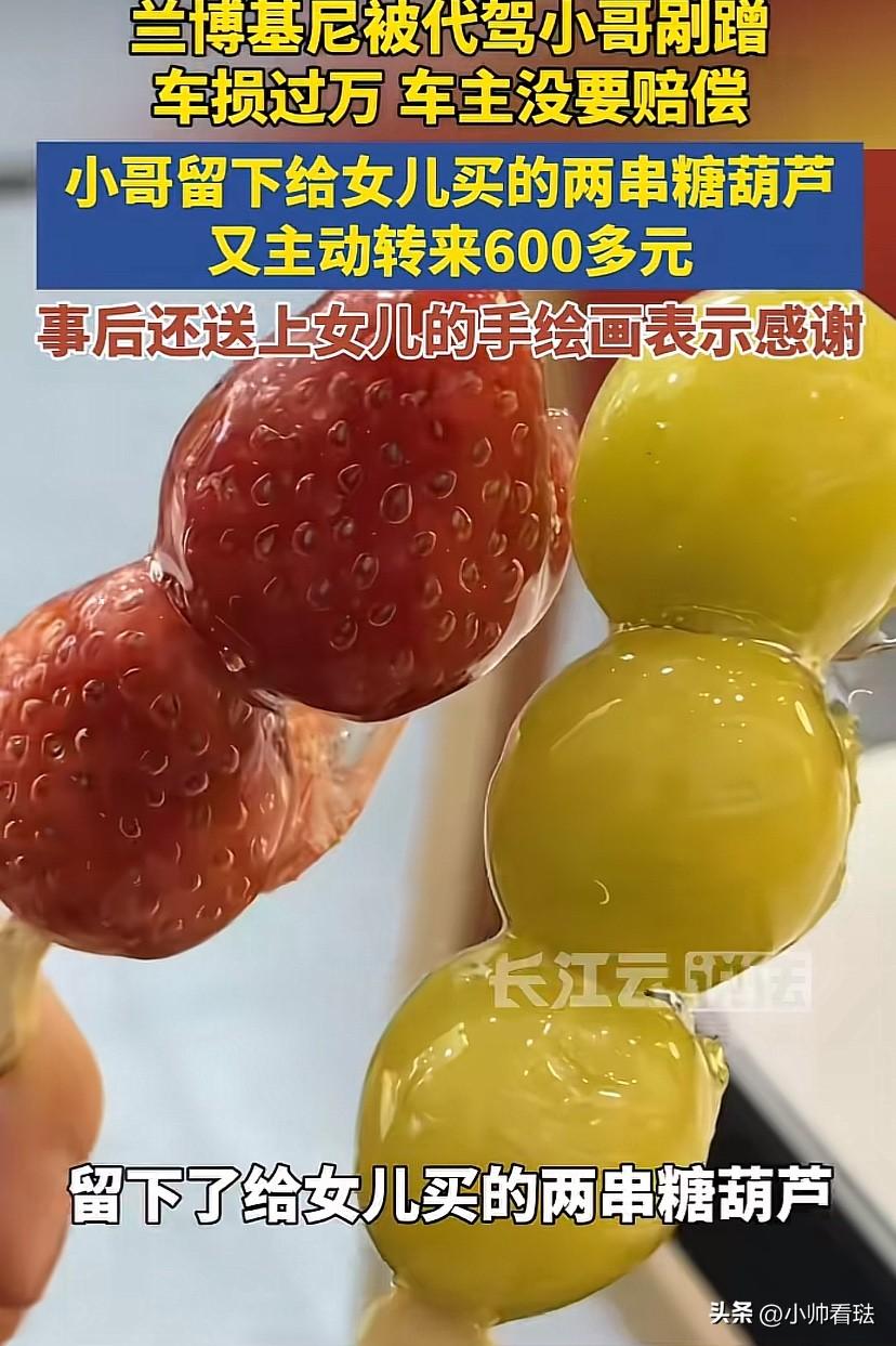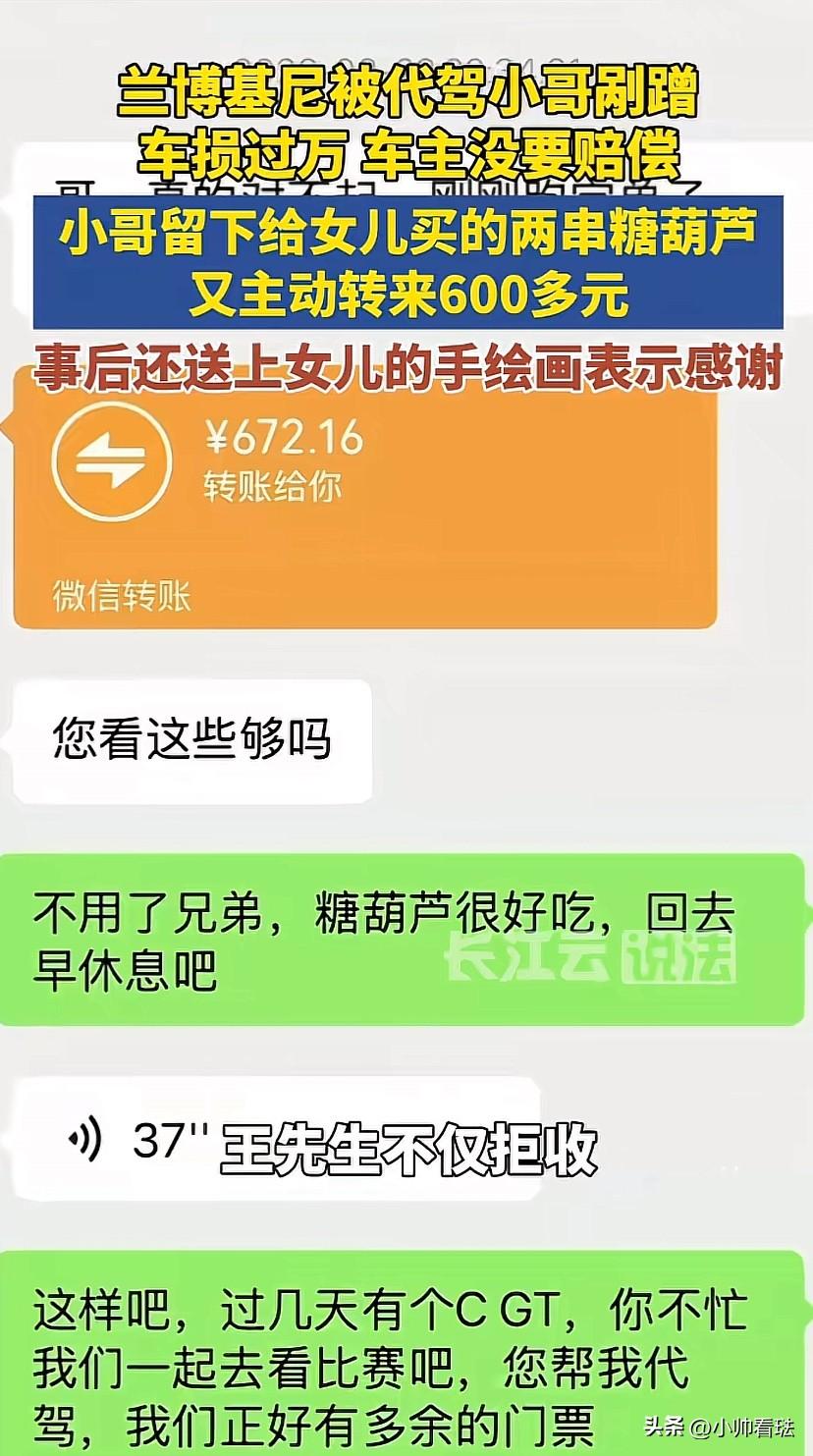 格局打开了!湖南长沙,一代驾小哥接单时,不小心刮蹭到了一辆兰博基尼,维修费上万元。结果,车主不仅没有埋怨,没有索赔,还拒收了小哥给转的钱,仅仅只收下小哥手中的两串糖葫芦。隔天,发来女儿的感谢信看哭网友! 当天晚上下着大雨,一代驾小哥在接单途中,由于雨天路滑,不小心刮蹭旁边的一辆兰博基尼。 代驾小哥当时就懵了,脑袋“嗡”的一下,这维修费不得上万元。结果,车主王先生下车后,没有指责小哥,没有索赔。并且还暖心的让小哥先完成订单。 代驾小哥心里过意不去啊,正好他身上带着给女儿买的两串糖葫芦,就赶紧递给车主。在小哥的再三坚持下,王先生也只好收下了这两串糖葫芦。 本以为事情就到此结束,小哥回家后又主动给王先生转账672.16元,王先生不仅拒收了,还得知这糖葫芦是给孩子买的,连糖葫芦的钱也一并退回。 第二天,王先生就收到了代驾小哥给发来的感谢信,还附上了自己女儿的手绘画,让王先生很是感动! 这感谢信被发到网上后,网友们都被感动得不行,有网友评论,这就是为什么人家开兰博基尼 不是没有原因的 它可以是672元 ,也可以是700元 。但它唯独是672.16元 很难想象这些钱他到底要赚多久 这个善举,也许就是点亮代驾师傅女儿对世界探索的一束光。很多有钱人的格局也是真的大! 看了这个视频我才知道——原来,善良才是这世间最贵的“维修费”!