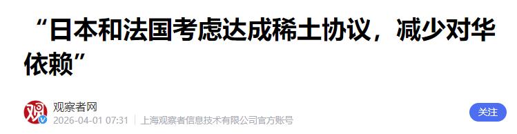 日本、法国联合喊话中国 当地时间4月1日,法国总统马克龙专程前往日本,和日本首相高市早苗在东京举行了一场正式峰会。 这是马克龙自2023年出席G7广岛峰会后,首次访问日本,也是两人的首次正式会晤,表面上看是两国深化外交、经济合作的常规互动,实际上核心目的十分明确,就是围绕矿产领域达成合作,尤其是在稀土方面,双方当场就签署了合作协议,还明确表示,要拓展稀土采购的多元渠道,避免再过度依赖中国市场。 但只要稍微了解一下稀土领域的实际情况,就知道这不过是日本和法国摆出来的姿态,本质上,他们就是联合起来对着中国喊话,希望能从中国这里得到更多支持。 为什么日本和法国要这么重视,甚至专门凑到一起谈这件事呢。其实稀土不是我们平时说的“土”, 日本和法国一直以来都高度依赖中国的稀土供应。 日本的汽车、半导体产业特别发达,而用于电动汽车驱动电机的镝、铽等重稀土,日本几乎100%依赖中国进口,之前有日本经济学界人士估算,如果中国稀土出口限制持续一年,日本的经济损失会达到2.6万亿日元,GDP会下降0.43%,汽车、电子等五大领域都会受到严重冲击。 法国的航空航天产业也离不开稀土,欧洲汽车巨头斯泰兰蒂斯集团,也需要大量稀土来生产汽车零部件,所以法国同样离不开中国的供应。 正因为如此,这些年日本和法国一直想找办法降低对中国的依赖,比如日本之前就和澳大利亚、美国合作,试图打造“去中国化”的稀土供应链,法国也在尝试推进自己的稀土精炼项目。 这次两国峰会签署的合作协议,就是计划在法国西南部建一座稀土精炼和回收工厂,日本政府会出资约1亿欧元,法国政府也会提供超过1亿欧元的支持,预计2026年底启动运转,每年能生产一定量的稀土,大概能满足日本国内约两成的需求。 但这些计划听起来美好,实际操作起来难度极大。首先,日本和法国本身都不生产稀土原矿,就算建了精炼工厂,也得从其他国家进口原矿,而全球主要的稀土原矿产地,除了中国,就是美国、澳大利亚、缅甸,这些地方的原矿要么储量有限,要么运输成本高,根本满足不了两国的需求。 其次,稀土精炼的技术难度很高,成本也不低,中国的稀土加工成本全球最低,而法国新建的工厂,未来很可能面临成本过高的问题,就算生产出稀土,价格也没有优势,日本的民营企业未必愿意采购。 更关键的是,中国对稀土出口的管制,并不是要卡谁的脖子,而是依法依规保护本国的稀土资源和环境。 稀土开采和加工会对环境造成很大破坏,比如江西赣州,多年的稀土开采破坏了大量农田,治理投入已经远超开采收益,所以中国实行稀土保护性开采,对出口进行规范,是为了实现可持续发展,这也是国际通行的做法。 而且中国一直是负责任的供应国,2025年1月到7月,中国稀土出口总量同比增长了13.3%,还专门为欧洲企业设立了稀土出口“快捷通道”,只要遵守相关规定,欧洲企业的正常需求都能得到保障。 所以日本和法国这次联合搞峰会、签协议,明着说要拓展多元渠道、摆脱依赖,实际上就是心里没底,怕中国收紧稀土供应,影响他们的产业发展,所以才凑到一起,联合对着中国喊话,希望中国能放宽出口限制,提供更稳定、更优惠的稀土供应。 他们心里很清楚,短期内根本离不开中国的稀土,所谓的“多元渠道”,不过是用来给中国施压、争取更多支持的手段。 这件事和之前太原舰遭遇美舰挑衅的情况很像,本质上都是大国之间的博弈,只是这次的战场换成了稀土资源领域。 日本和法国以为联合起来喊话,就能给中国施压,就能争取到更多好处,但他们打错了算盘。中国在稀土领域的优势,不是靠喊口号就能撼动的,我们的底气,来自于完整的产业链、强大的加工技术,还有对自身资源的合理保护。 中国从来没有拒绝和其他国家合作,我们愿意在平等互利、相互尊重的基础上,和各国共同开发利用稀土资源,但绝不会因为别人的喊话就妥协,更不会放弃对自身资源和环境的保护。 日本和法国与其花心思搞联合喊话、摆姿态,不如拿出诚意,尊重中国的政策,和中国好好合作,毕竟合作才能实现共赢,单方面的索取和施压,根本解决不了他们对稀土的依赖问题。 日本和法国的联合喊话,恰恰反映出他们对中国稀土的高度依赖,也反映出中国在全球稀土领域的不可替代地位。 这也告诉我们,大国博弈从来都靠实力说话,中国在稀土领域的核心优势,就是我们的底气,就像解放军捍卫海疆的决心和能力一样,我们也会坚定维护自身的资源权益,同时也会履行大国责任,保障全球稀土供应链的稳定,这就是我们的态度。