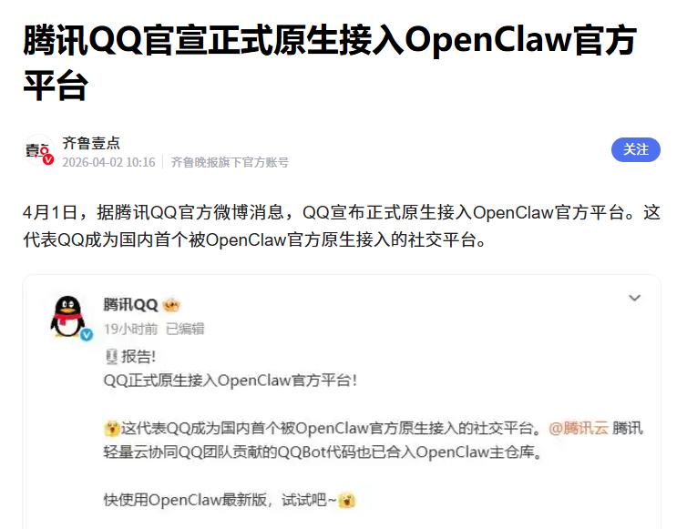 QQ原生接入openclaw官方平台 据了解,近日腾讯QQ官方发文表示,QQ已经实现了openclaw官方平台的原生接入。 本次合作不仅会为用户带来内置的QQ Bot插件,还将支持多账号、凭证管理(SecretRef)、Slash 命令等功能,为用户带来更加多元的使用体验。