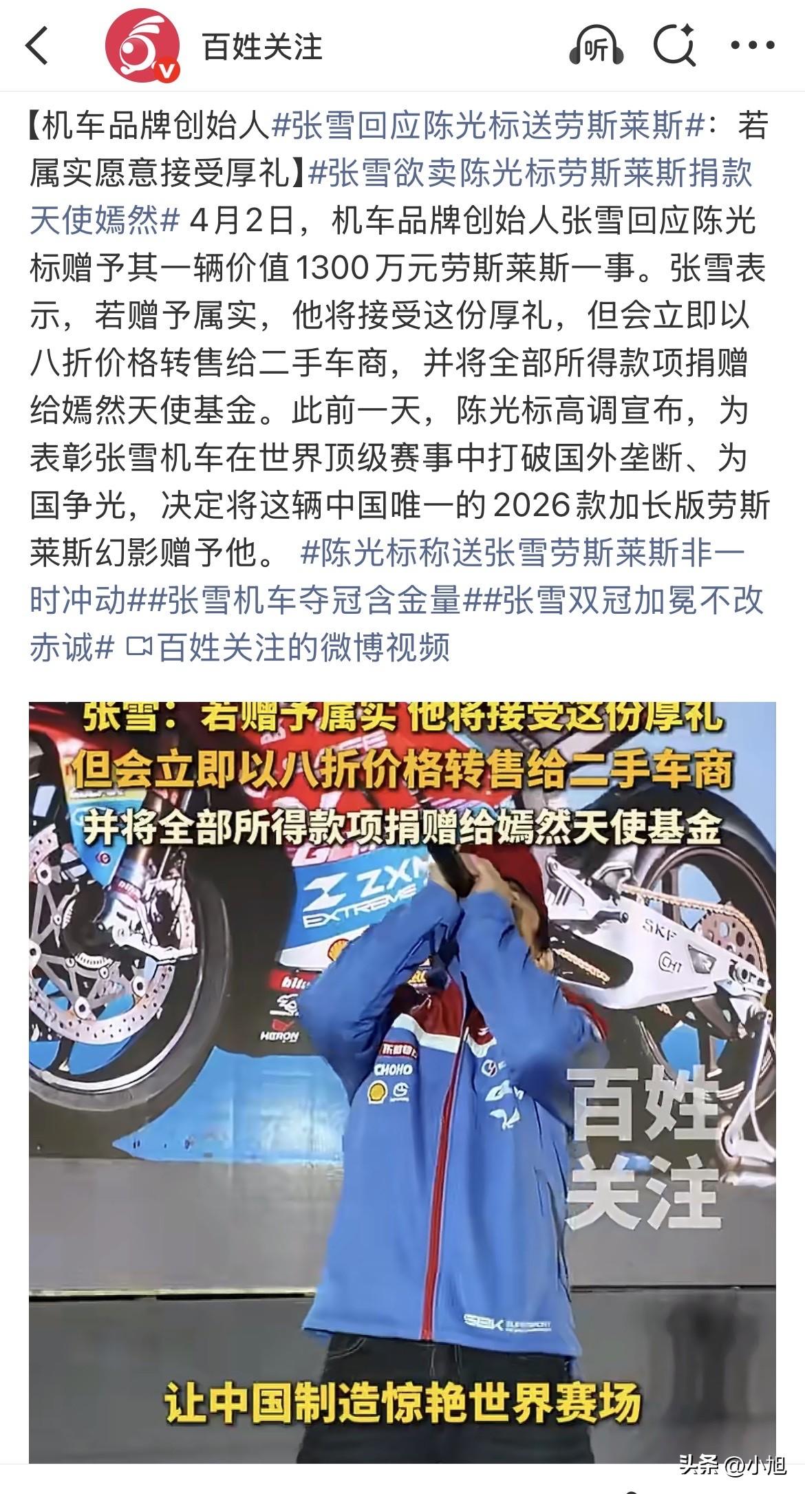 陈光标那边是真心实意要送。4月1号他专门录了视频,说张雪带着中国机车在WSBK葡萄牙站连拿两个冠军,打破了国外几十年的垄断,“看得我热血沸腾”。他说送车不是冲动,是觉得“为国拼搏的人永远值得最高礼遇”。