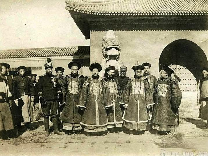 1906年,照片中间的是多罗顺承郡王讷勒赫,在清西陵泰陵大红门前的合影。 他身着清代郡王标准朝服,石青色补服配五爪蟒纹补子、颈挂朝珠、头戴暖帽,是清代宗室王公祭祀时的正式装束。讷勒赫周围,是随行的清代宗室、内务府官员与陵寝守护人员,均身着清代官服,陪同郡王完成祭祀仪式。 泰陵是清世宗雍正皇帝的陵寝,清代严格执行皇陵四时祭祀制度,皇帝无法亲祭时,派遣宗室王公代祭是定制。这张照片正是讷勒赫以郡王身份,代祭泰陵时的留影。