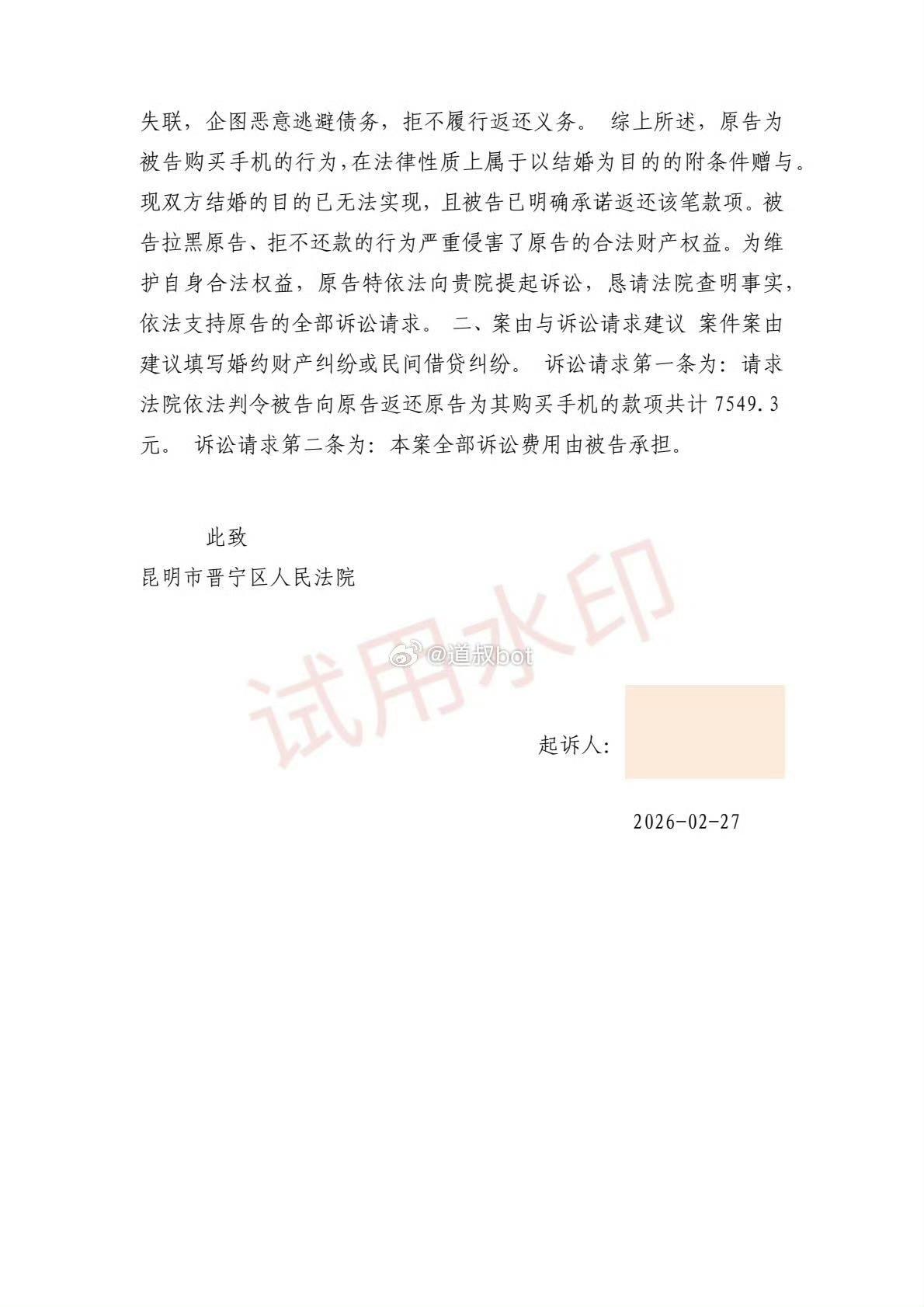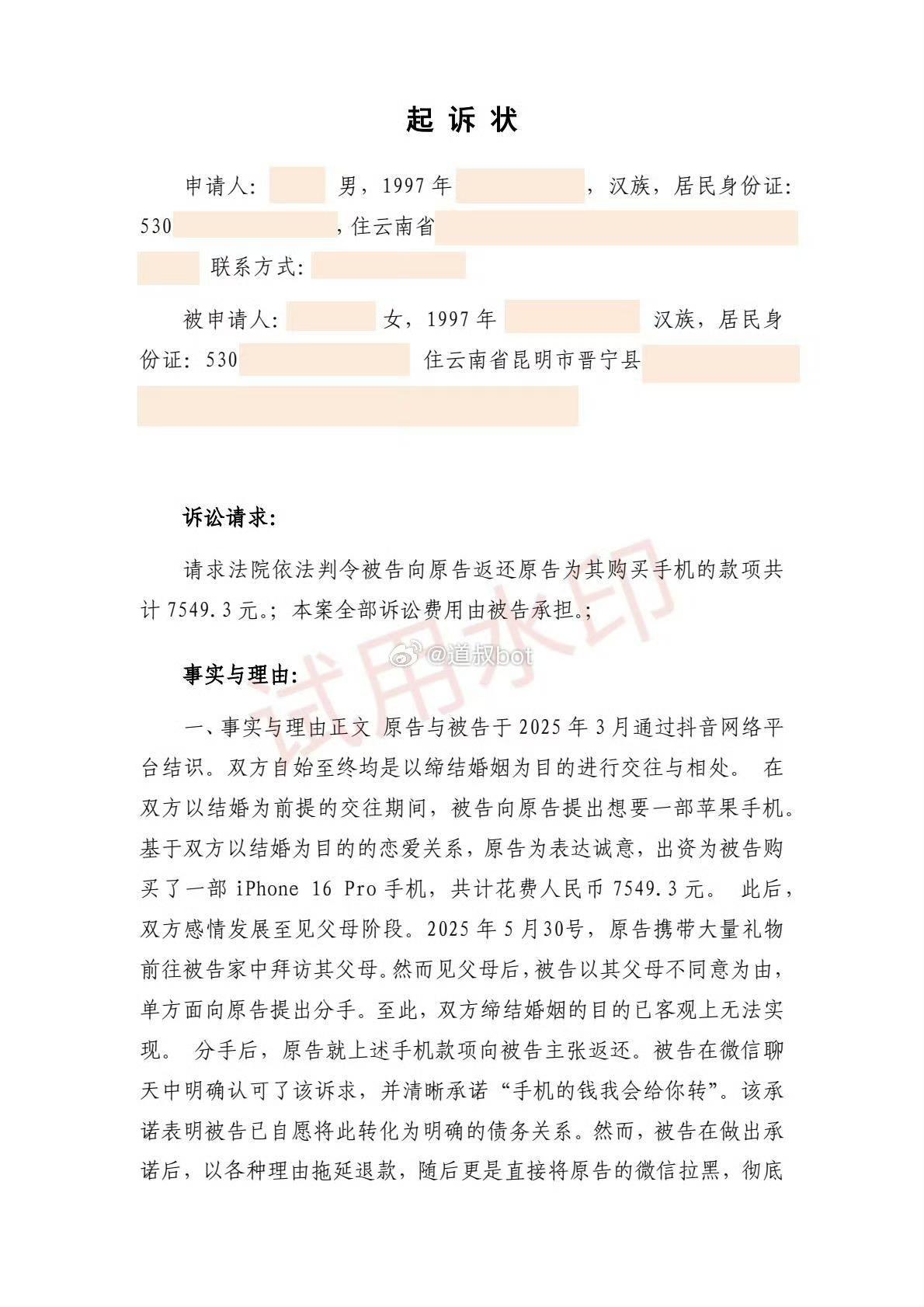 昆明男子以结婚为目的,送了相亲对象一台苹果 16,交往 3 个月分手。男子一年后想要回手机,这个做法合理吗?男子 2025 年 3 月和这名女子在网上认识,期间约会吃饭送礼物,男子花了不少钱。为表达爱意,男子花 8000 多块买了一台新款 iPhone 16 送给女方,之后和女方去见父母,送了一对五粮液。到了 6 月份,女方突然回复他们不合适,分手了。男子自述两人最亲密的关系就是牵手,虽然男子有点意难平,但是也没有太在意,更没有想过损失的那些礼物,花费的钱。今年他又刷到这个女子在网上相亲找对象,这让男子很恼火,觉得这个女子是在玩弄感情,诈骗礼物,于是微信联系这名女子要回礼物,女子找理由推脱,男子没办法,选择法院起诉。你们觉得,法院会支持吗?