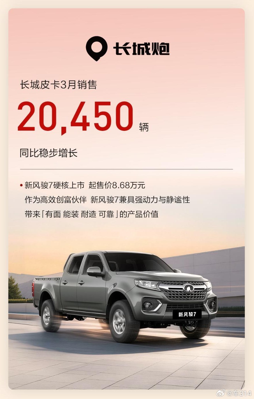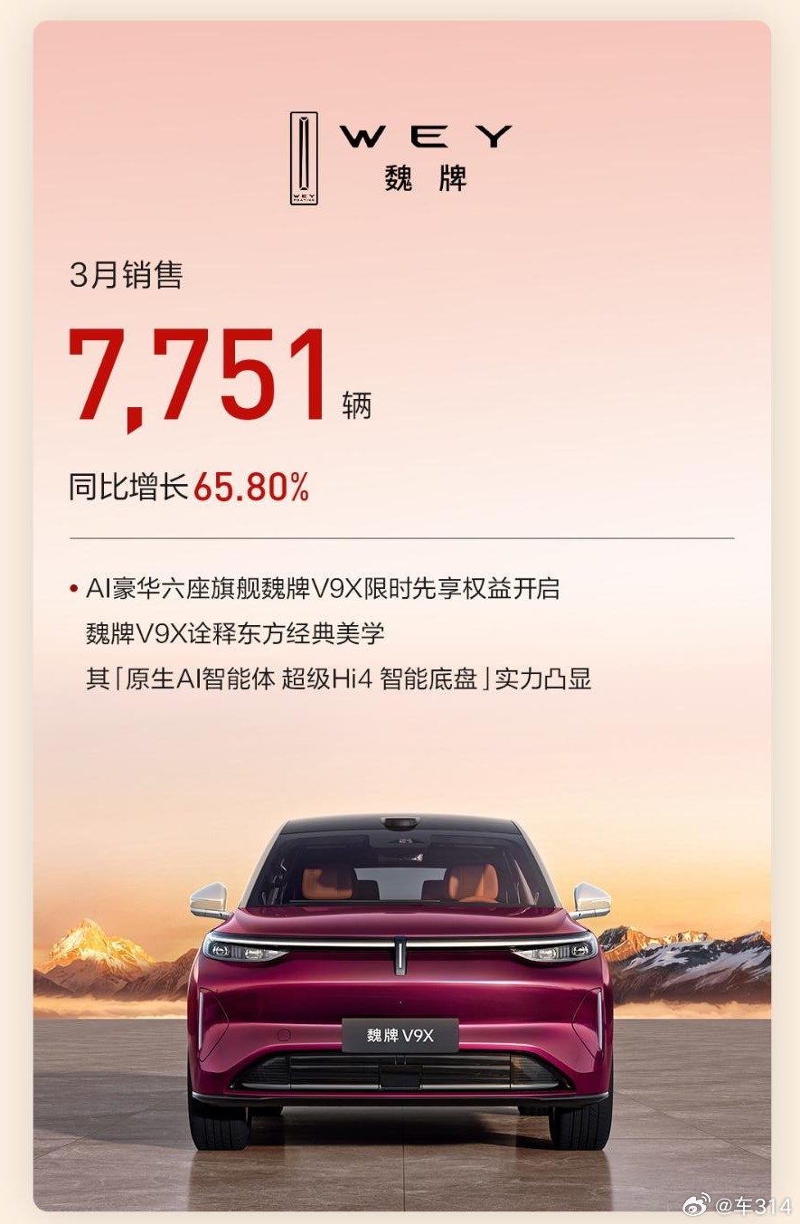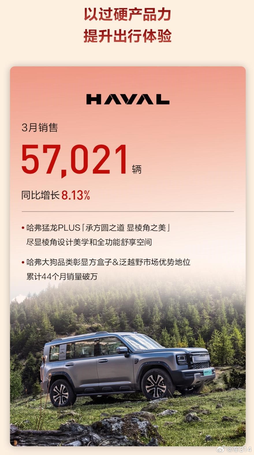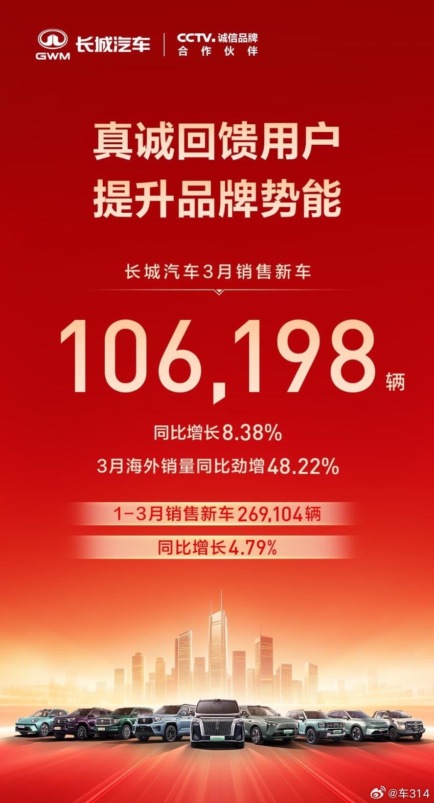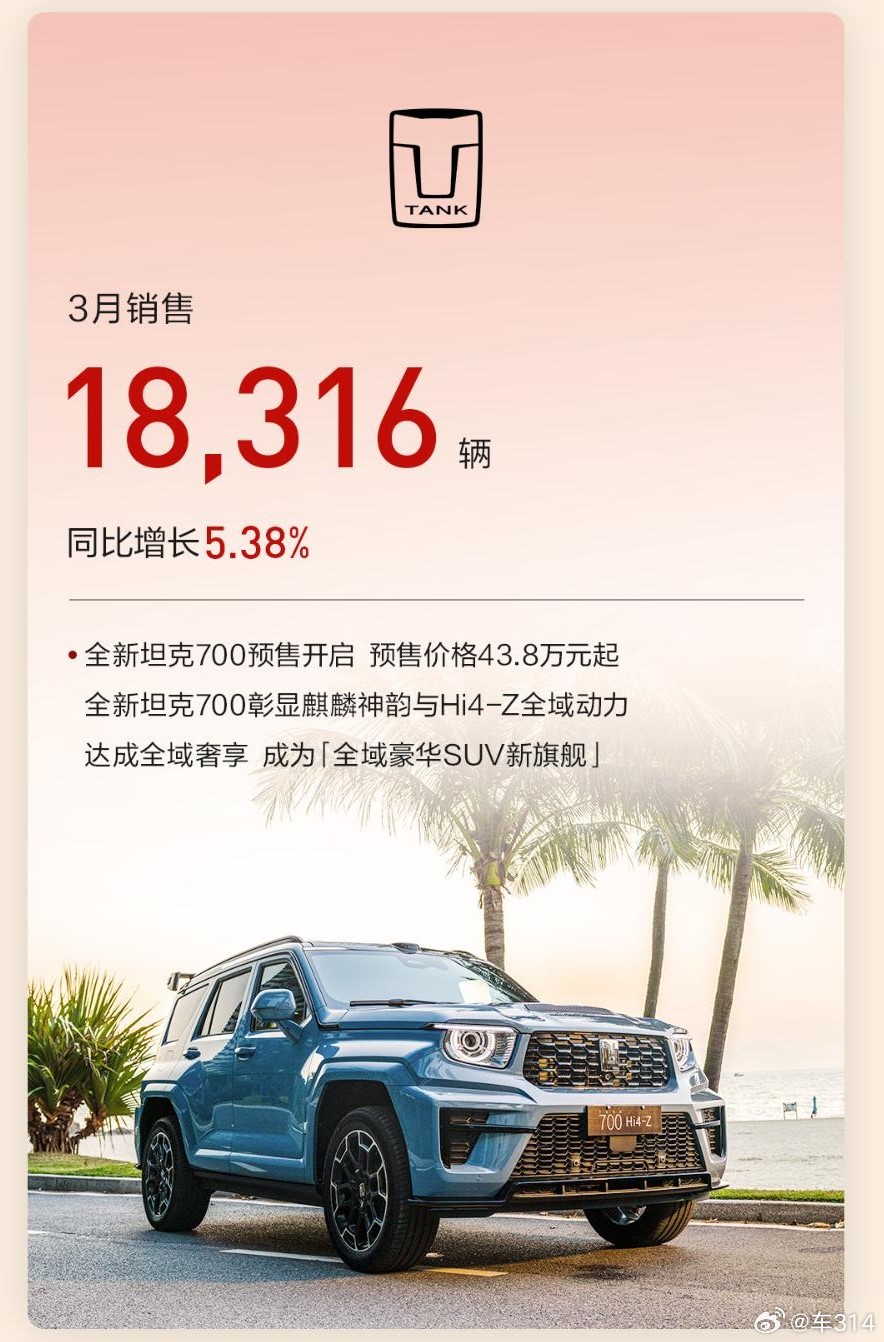 刚刚,长城汽车公布了3月份的成绩,共销售106198台新车,同比增长8.38%,今年一季度累计销售新车269104辆,同比增长4.79%。其中增速最大的是魏牌,销售7751台,同比增长65.80%,哈弗也销售了57021台,同比增长8.13%。坦克销售18316台,同比增长5.38%。在竞争白热化的今天,长城不仅坚守着“行业老炮”的底色,更在新能源方面快速挺进,同时在高端领域进展显著,魏牌V9X与全新坦克700成为豪华矩阵顶梁柱,把“越野+豪华”写进了长城汽车的基因里!长城汽车3月销售106198台新车长城汽车全新坦克700来了魏牌v9x长城汽车