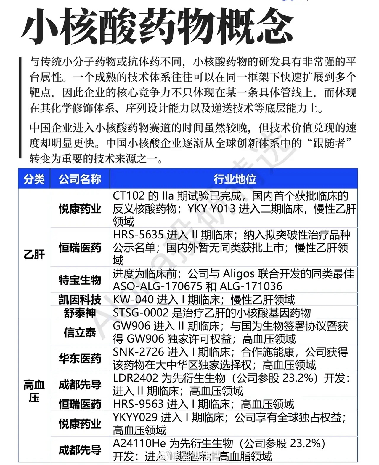 小核酸药物赛道:防御属性凸显,核心标的价值解析在地缘冲突反复扰动、市场震荡加剧的背景下,历经长期调整的医药板块凭借防御属性迎来配置窗口,小核酸药物作为创新药领域的高成长细分赛道,凭借平台化研发、长效治疗的独特优势,成为医药板块的核心投资方向。以下对赛道核心企业逐一解析:悦康药业公司以仿制药为基础,转型聚焦小核酸药物研发,搭建自主GalNAc递送系统,管线覆盖乙肝、高血压、高血脂三大千亿级适应症。CT102为国内首个获批临床的反义核酸药物,YKYY015是国内唯一获美国IND批准的长效降脂siRNA药物,YKYY029、YKYY013等管线同步推进,叠加成熟的医药渠道资源,有望快速抢占国产小核酸药物市场份额,成长潜力突出。恒瑞医药作为国内创新药龙头,恒瑞医药通过自主研发与合作布局双轨推进,覆盖乙肝、高血压、高血脂等大适应症。HRS-5635乙肝siRNA药物纳入拟突破性治疗品种,II期临床验证功能性治愈潜力;HRS-9563等管线快速推进,2025年小核酸资产海外授权交易获国际认可。凭借龙头研发实力、临床资源与渠道优势,有望填补乙肝等领域市场空白,重塑慢病治疗格局。特宝生物、凯因科技两家企业均聚焦乙肝赛道精准布局:特宝生物依托乙肝领域临床经验,与Aligos合作引进小核酸管线,有望实现“干扰素+小核酸”联合治疗方案,巩固乙肝市场地位;凯因科技以乙肝功能性治愈为核心,KW-040 siRNA药物进入临床,通过多靶点联合研发契合临床需求,在国产乙肝小核酸药物中具备突围潜力。信立泰、华东医药两家企业聚焦高血压等慢病领域:信立泰引进GW906 AGT-siRNA药物,依托成熟的高血压渠道资源,有望快速推动产品商业化,完善慢病治疗体系;华东医药引进SNK-2726等小核酸管线,凭借慢病领域渠道优势,快速补全小核酸布局,实现产品协同。前沿生物、成都先导前沿生物聚焦肾病赛道,两款潜在全球首创小核酸药物临床前数据优异,有望开辟IgA肾病百亿蓝海市场;成都先导以DEL技术为核心,参股先衍生物布局临床管线,覆盖小核酸研发全链条,占据产业链上游核心地位。产业链配套企业递送技术领域的键凯科技、热景生物,原料药及CDMO领域的联化科技、九洲药业,载体填料领域的蓝晓科技、纳微科技等,为小核酸药物研发提供核心支撑,受益于行业爆发式增长。风险提示:小核酸药物研发存在临床不确定性,行业竞争加剧,投资需谨慎。
