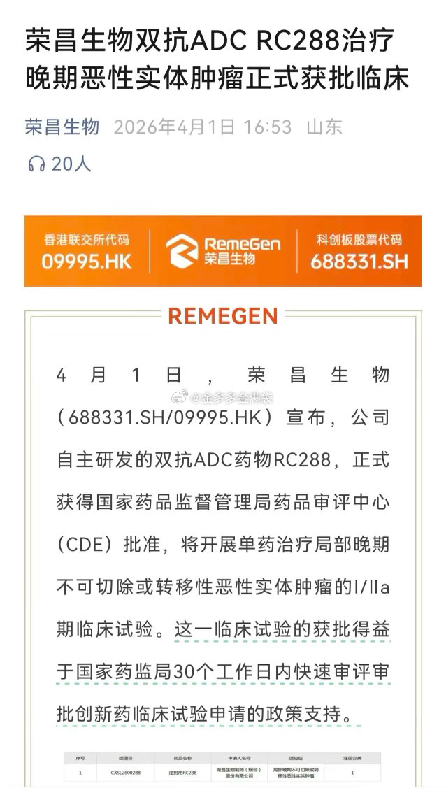 盘后荣昌生物公众号又发布了利好,公司正一步步成长为自免和肿瘤方面的重要创新药公司。