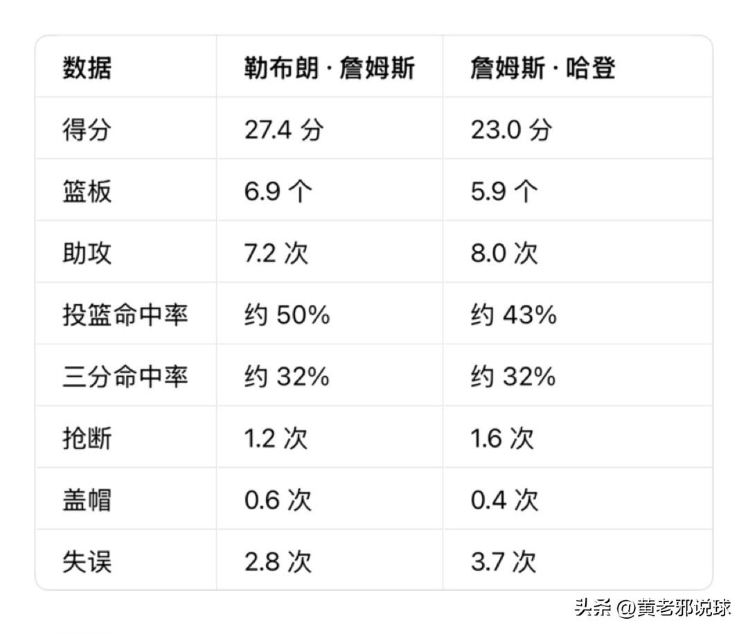 双詹对战数据对比,还有机会在骑士合兵一处吗?对比一下就知道了 截至 2026 年 4 月初,勒布朗·詹姆斯 vs 詹姆斯·哈登,常规赛交手完整数据对比: • 交手场次:37 场 • 总战绩:詹姆斯 20 胜 17 负 一、常规赛直接对位场均数据(生涯) 勒布朗·詹姆斯: • 得分:27.4 分 • 篮板:6.9 个 • 助攻:7.2 次 • 投篮命中率:50% 左右 • 三分命中率:32% 左右 • 抢断:1.2 次 • 盖帽:0.6 次 • 失误:2.8 次 詹姆斯·哈登: • 得分:23.0 分 • 篮板:5.9 个 • 助攻:8.0 次 • 投篮命中率:43% 左右 • 三分命中率:32% 左右 • 抢断:1.6 次 • 盖帽:0.4 次 • 失误:3.7 次 二、胜负与关键影响对比 1. 胜负走势 • 生涯:詹姆斯 20-17 领先 • 近年(近5年):基本持平(约 7-7) • 巅峰期(火箭詹 vs 骑士/热火詹):詹姆斯明显占优 2. 比赛影响力(常规赛直接对话) • 詹姆斯优势: ◦ 得分更高、效率更高(场均高约 4–5 分,命中率高 7%+) ◦ 篮板、防守更稳(盖帽、护框、篮板卡位更强) ◦ 关键时刻更稳、胜率更高(整体 20-17) ◦ 身体、错位、攻防两端统治力更强 • 哈登优势: ◦ 组织、传球略优(场均多 0.8 助攻) ◦ 造罚球、三分产量更多 ◦ 持球大核打法,球权占有率更高(30.9% vs 28.5%) 三、综合分析:谁对常规赛胜负影响更大? 结论:勒布朗·詹姆斯在直接对话中,对比赛胜负的贡献与影响力更大。 理由: 1. 战绩直接胜出:20-17,长期占优。 2. 效率与产量更稳:得分高、命中率高,更高效地主导得分。 3. 攻防更全面:防守端(篮板、盖帽、抢断)明显更强,能从多维度影响比赛。 4. 错位与体型压制:6'9" 前锋 vs 6'4" 后卫,詹姆斯在体型、力量、转换进攻上占优。 5. 失误控制更好:场均少 0.9 次失误。 哈登定位: • 顶级持球大核、得分+组织双修,但防守偏弱、效率偏低、失误偏多。 • 更依赖三分与罚球,面对詹姆斯的体型与防守时,命中率会下滑。 简单说: 常规赛直接对位,詹姆斯是“更全能、更高效、更能赢”的一方;哈登是“更偏组织与外线进攻”的一方,但整体影响力稍逊。 所以,二位詹姆斯现在都是持球大核,很难兼容对方的打法,都需要大量球权,应该很难在骑士合兵一处了,因为如果大詹来了,小詹第二年肯定要有,同理,小詹已经在骑士了,大詹就不会再来了!湖人队记詹姆斯 哈登篮球哲学