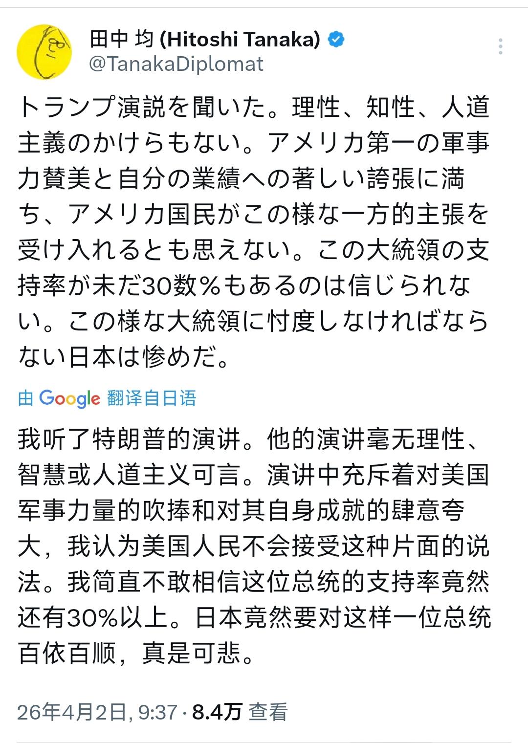 日本著名外交官、前外务副大臣田中均今天(4月2日)发文写道:“我听了特朗普的演讲。他的演讲毫无理性,智慧或人道主义可言。演讲中充斥着对美国军事力量的吹捧和对其自身成就的肆意夸大,我认为美国人民不会接受这种片面的说法。我简直不敢相信这位总统的支持率竟然还有30%以上。日本竟然要对这样一位总统百依百顺,真是可悲。” [机智]评几句:日本情况可能更糟糕,极端右翼高市早苗暴走,仍然有70%左右的高支持率。前外务副大臣田中均痛批特朗普演讲无理性、无人道,怒斥日本对其百依百顺的可悲,恰是戳中了日本政坛的畸形现实。高市为攀附美国,一味推动修宪扩军、献媚追随,将日本绑上美国霸权战车,却能凭借民粹话术收割高支持率,暴露出日本社会被右翼裹挟的深层病灶。一边是清醒者对美日不对等关系的痛心疾呼,一边是右翼势力借对美依附谋政治私利,田中均的怒斥,不过是在日本对美盲从的死局中,发出的一声无人在意的哀鸣。