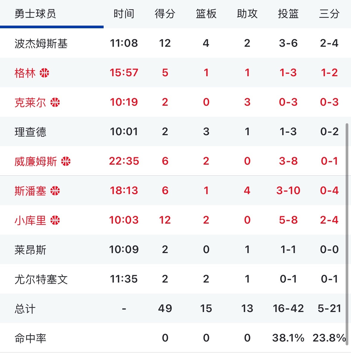 赛斯库里今天很准12分 波杰也是12分文班亚马半场27分13篮板 马刺vs勇士
