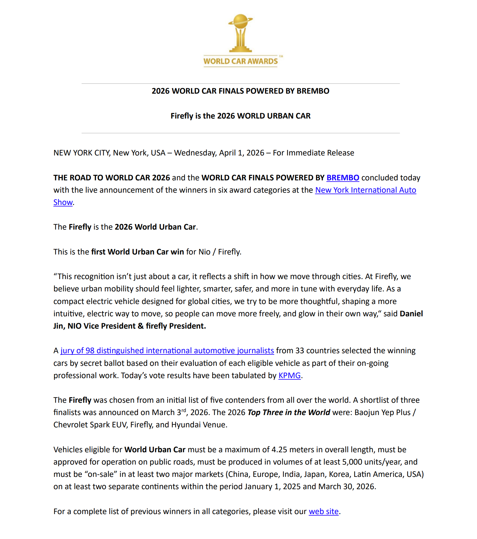 所以结论就是萤火虫总裁金舸说的,萤火虫凭借自己的轻盈、智能、安全的特性,打动了全球各地的汽车记者,让大家有了广泛的共识,把 2026 世界城市之车大奖给了萤火虫。