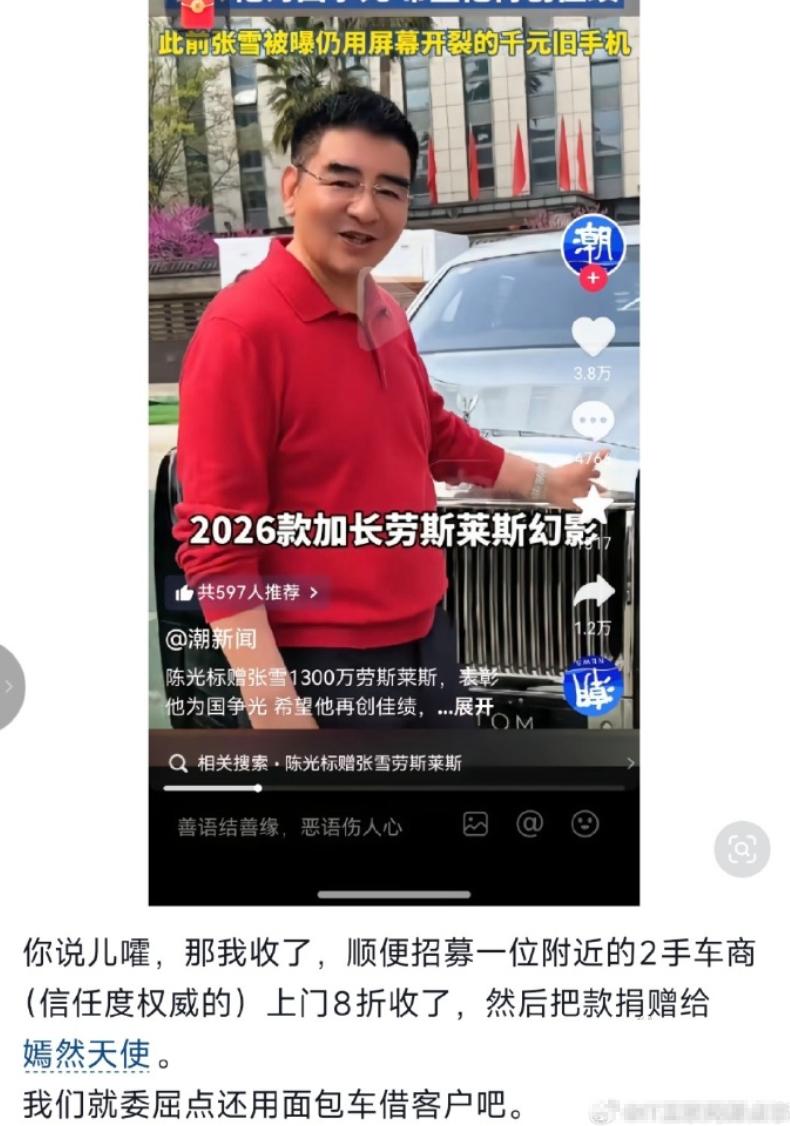 炸翻全网!张雪凌晨官宣回应陈光标赠车,一句话圈粉百万🤬 不贪财、不炫富,不配合作秀。 反手一招,把流量套路打得体无完肤! 先复盘前因后果,句句戳心,不服来辩! 4月1日,陈光标高调官宣。 要送张雪一台1300万的劳斯莱斯。 还是中国唯一一辆2026款加长幻影。 拍视频、晒豪车,吹得天花乱坠。 说什么“为国争光值得最高礼遇”。 说什么“被张雪的奋斗事迹感动”。 可明眼人都看得懂:全是套路! 没提前联系张雪,直接全网官宣。 选在愚人节发消息,留足退路。 自己没上牌、没开,转头就晒视频蹭热度。 说白了,就是借张雪的冠军流量,给自己立人设! 全网都在猜,张雪会怎么接? 是欣然接受,顺势炫富? 还是委婉拒绝,得罪人? 没想到,张雪的回应,清醒到可怕! 凌晨直接发文,不绕弯子: “那我收了,招募权威车商8折收购。” “所得全款,捐给嫣然天使基金。” 最后补了一句,格局直接封神: “我们委屈点,还用面包车接客户。” 太解气了!真的太解气了! 这一手,既给了陈光标面子。 又没被流量绑架,还做了慈善。 反观陈光标,瞬间被打脸! 他连忙留言,说“初心是让张雪个人使用”。 装模作样说“误会了”,实则慌了神。 毕竟,他压根没料到,张雪不按套路出牌! 有人酸张雪:装什么清高,收了再捐就是作秀。 放屁!你看看张雪的过往,就知道他有多清醒! 身价上亿,还在用屏幕开裂的2000块旧手机。 连汽车驾照都没有,要劳斯莱斯没用。 公司研发投入上亿,哪怕亏损也不趁机涨价。 他连自己都舍不得花钱,怎么会贪这1300万的豪车? 他捐的不是钱,是格局!是初心! 是“为国争光不是为了捞好处”的清醒! 再看看陈光标,多少人被他的“慈善”忽悠过? 高调炫富、高调行善,每次都要全网通报。 借别人的热度,刷自己的存在感。 这次蹭张雪的冠军流量,本想名利双收。 没想到,被张雪的清醒,狠狠打了脸! 张雪的回应,给所有公众人物上了一课: 真正的荣耀,不是靠豪车堆砌。 真正的格局,不是靠作秀彰显。 为国争光,是脚踏实地的拼搏。 心怀善意,是默默无闻的付出。 比起陈光标的高调作秀,张雪的低调清醒,更让人敬佩。 比起1300万的豪车,他捐给嫣然天使的善款,更有重量。 这就是张雪,一个从修车学徒逆袭的冠军。 不恋浮华,不贪名利,心怀家国,心有善意。 他用行动证明:真正的偶像,从来都是这样清醒又有担当! 愿更多人,能学学张雪的清醒。 少一点流量套路,多一点真心实意。 少一点高调作秀,多一点实际行动。 张雪回应陈光标赠车 看完彻底服了!你觉得张雪的回应够格局吗?陈光标是真心赠车还是蹭流量?评论区说出你的看法👇