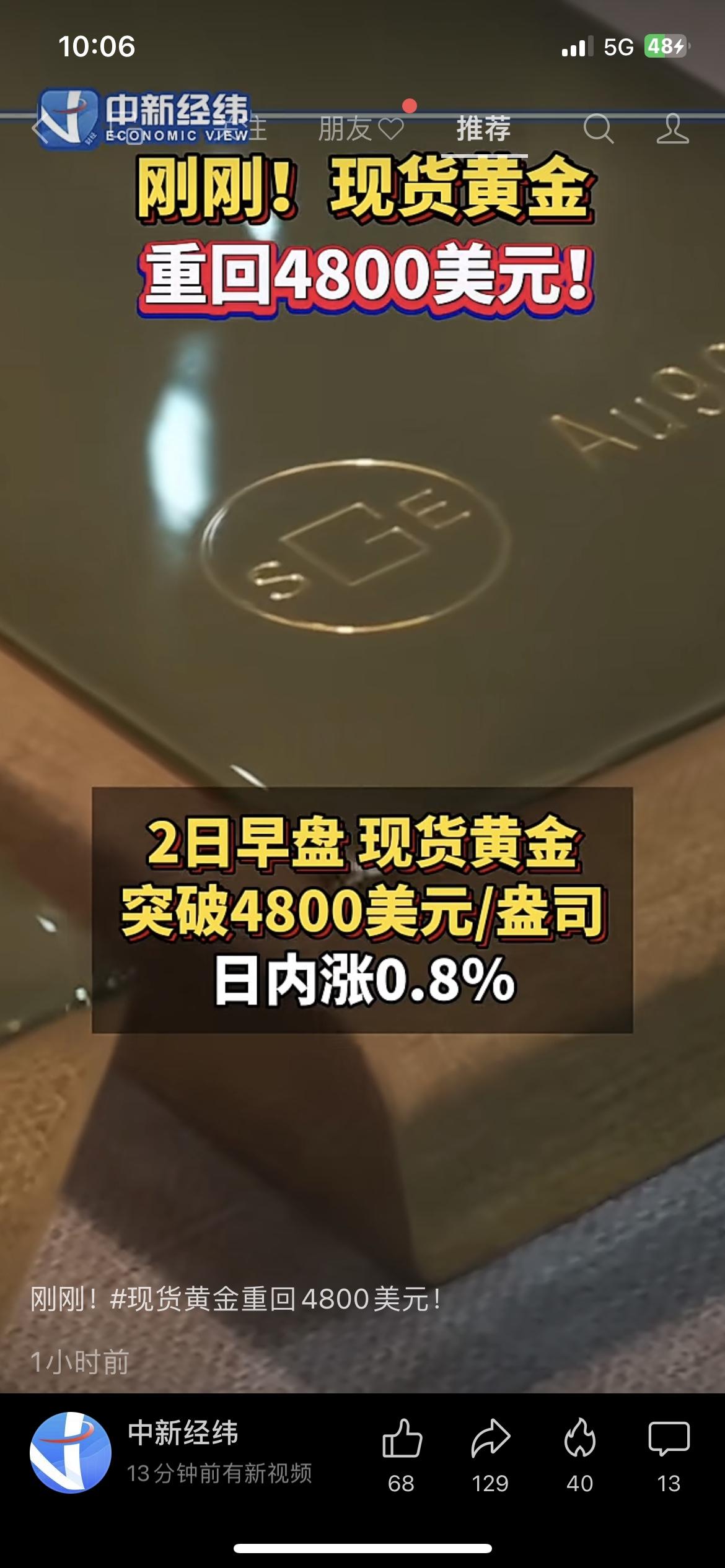 金价再冲新高!突破4800美元,有黄金的赚了 关注理财的朋友注意了,黄金又有大动作! 现货黄金直接突破4800美元/盎司,日内上涨0.8%,走势十分强劲。 受地缘局势与全球经济环境影响,黄金避险属性持续凸显,完美印证了乱世黄金的说法。 手里持有黄金的朋友,这波行情确实让人惊喜,后续走势也值得持续关注。 黄金大涨 现货黄金 理财干货
