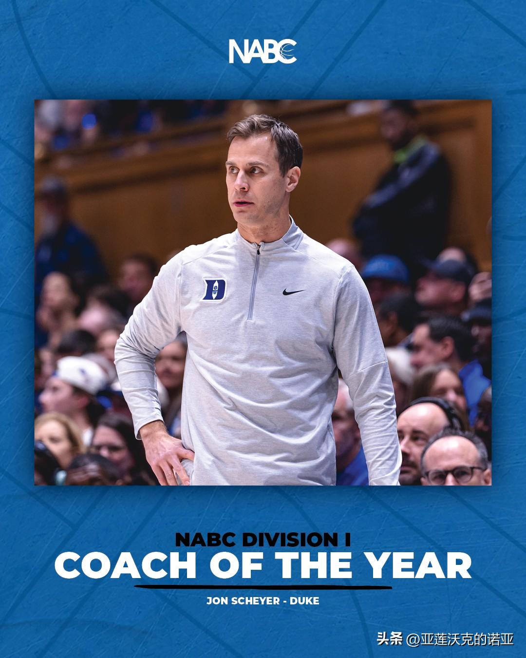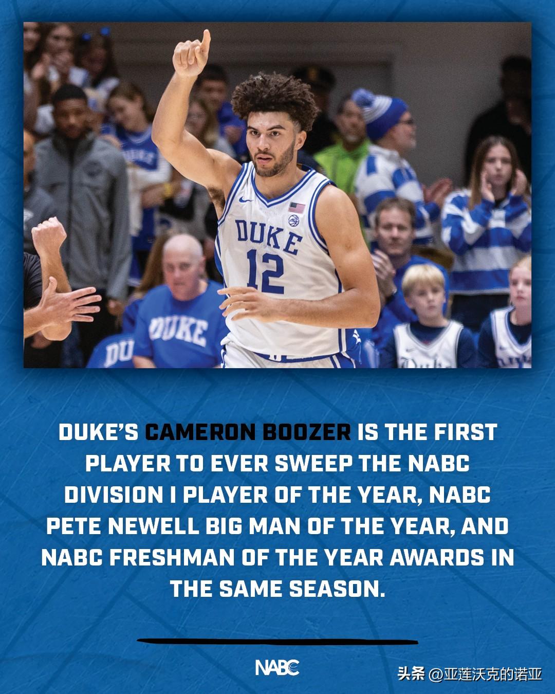 杜克前锋Cameron Boozer被NABC美国篮球教练协会评为全美最佳球员,同时还荣获皮特-纽维尔Pete Newell最佳大个子球员奖以及NABC年度最佳新人,38岁主帅Jon Scheyer执教蓝魔取得35胜3负的战绩拿到最佳教练,成为自1999年老K以来首位摘得NABC最佳教练的杜克教头。