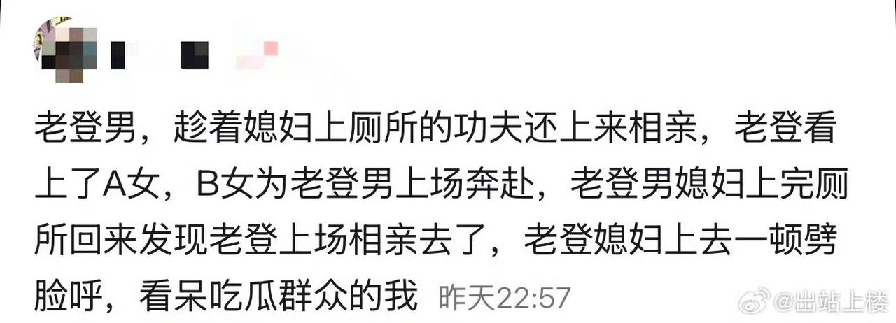 开封王婆相亲现场现闹剧,已婚男子趁老婆上厕所上去相亲凑热闹。两个小仙女上去相亲,这名中年男子不知道是心动了,还是想上去开个玩笑,或者说是节目效果。男子一板一眼冲上去和两个打得火热,表现出很急切要相亲的样子,对女嘉宾表现的格外热情。突然从背后窜出一个女子,指着他大骂,你是都是有老婆的人,还上去撩骚,安的什么心?男子瞬间尴尬,试图辩解或逃跑,老婆在后面追打,相亲现场秒变“抓奸现场”,全场观众哗然、爆笑并纷纷拍视频。