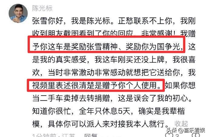这下陈光标坐不住了,直接在评论区给张雪留言,说自己送车就是奖励张雪个人,奖励他为国争光,视频里说的明明白白是赠予个人。
