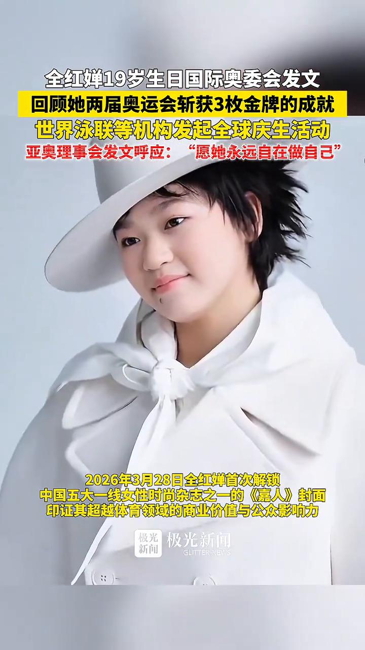 全红蝉19岁生日,国际奥委会发文回顾她两届奥运会斩获3枚金牌的成就。 极光新闻。 世界泳联等机构发起全球庆生活动,亚奥理事会发文呼应:"愿她永远自在做自己"。 2026年3月28日,全红婵首次解锁中国五大一线女性时尚杂志之一的《嘉人》封面,印证其超越体育领域的商业价值与公众影响力。