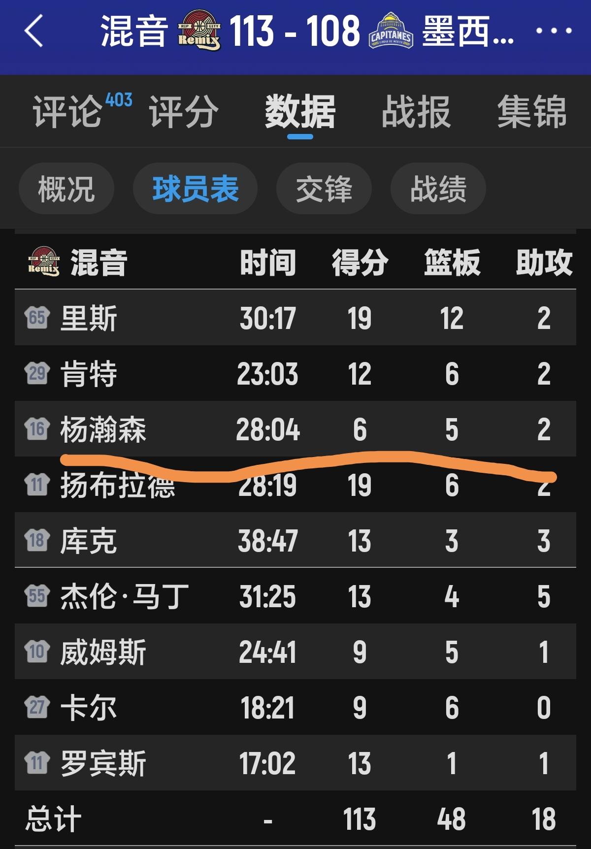 决定胜负的关键时刻杨瀚森0分0板0助0帽,甚至是 0挡拆0策应0干扰,但混音队教练仍坚持把他放在场上,这是真爱啊!说教练不给杨瀚森制定战术,不给内线给球不是不懂球就是喷着玩! 坐在场边的杨瀚森又累又难受!打了28分钟,高反加上开拓者和混音长途来回折腾,难受的直捂肚子! 6分5板2助2帽!数据显得有点凄惨,但正负值是+5!关键球队赢球进入了下一轮!
