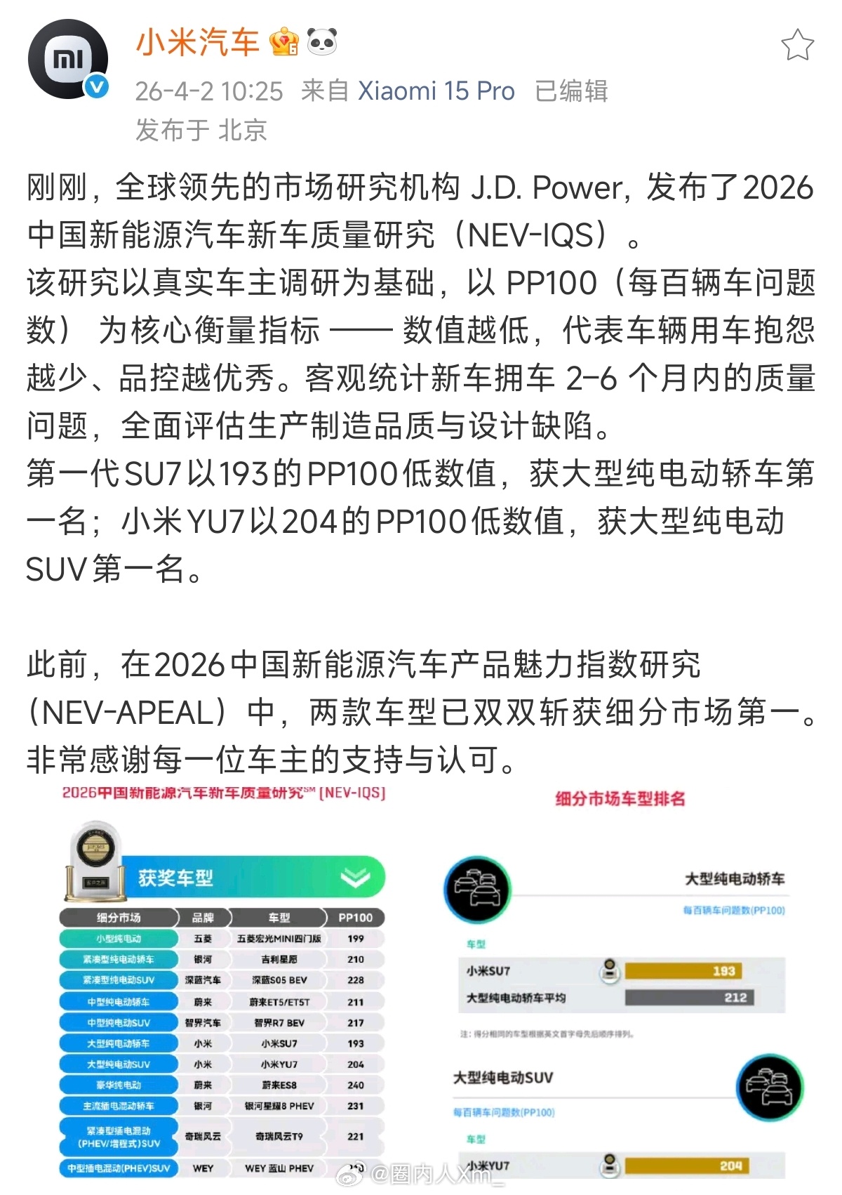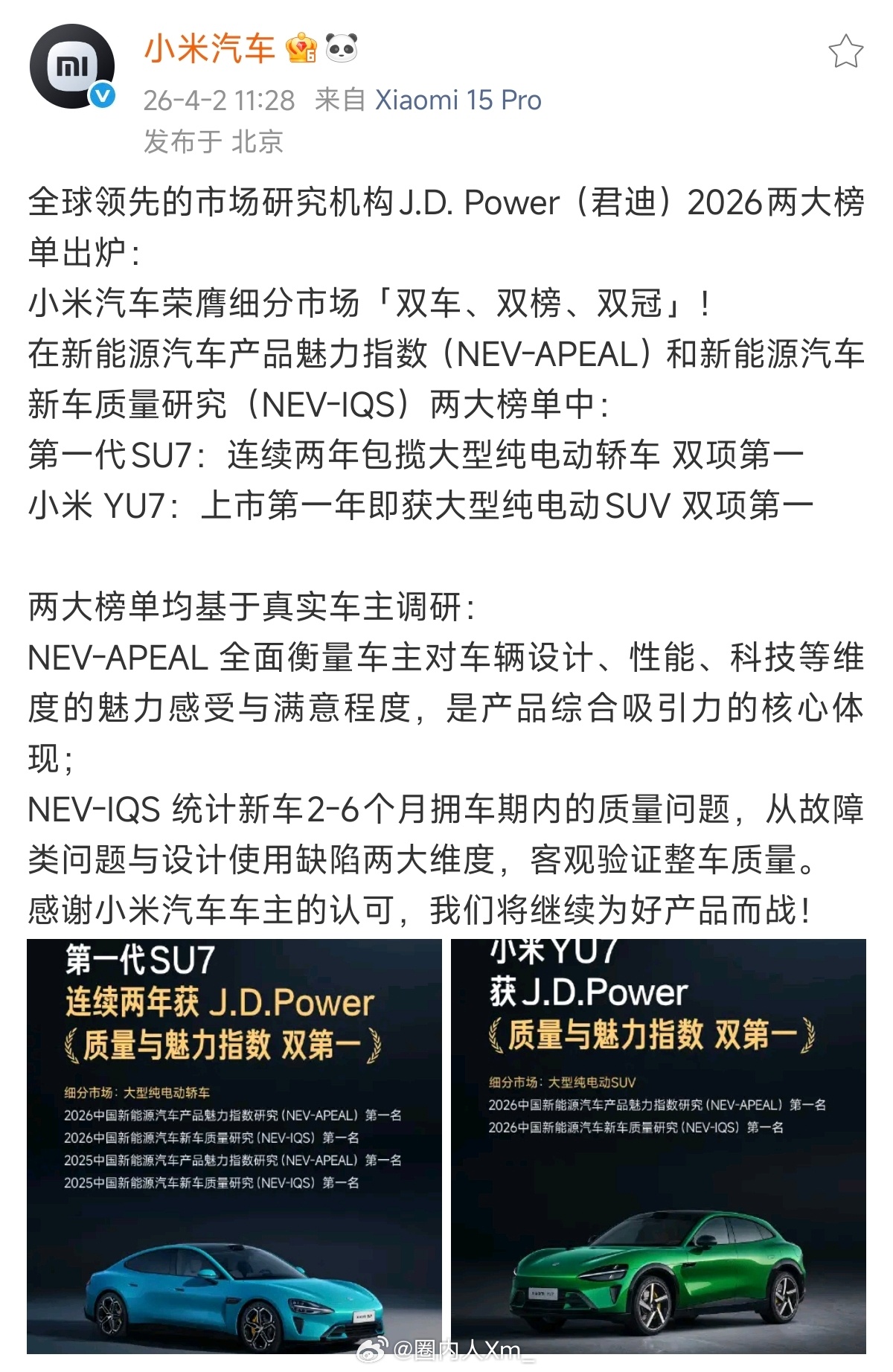 JDpower小米双车双榜第一JDPower质量榜小米SU7总榜第一