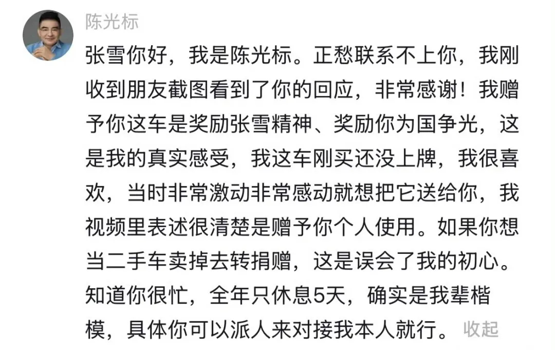 【陈光标赠张雪车最新回应:我赠予你这车是奖励张雪精神,如果你想捐赠,这是误会了我的初心】陈光标称张雪误会我的初心据江南都市报报道:4月2日,就张雪想卖陈光标赠送豪车给嫣然捐款,陈光标在评论区给张雪留言:“张雪你好,我是陈光标。正愁联系不上你,我刚收到朋友截图看到了你的回应,非常感谢!我赠予你这车是奖励张雪精神、奖励你为国争光,这是我的真实感受,我这车刚买还没上牌,我很喜欢,当时非常激动非常感动就想把它送给你,我视频里表述很清楚是赠予你个人使用。如果你想当二手车卖掉去转捐赠,这是误会了我的初心。知道你很忙,全年只休息5天,确实是我辈楷模,具体你可以派人来对接我本人就行。”4月1日,慈善家陈光标在社交平台发布视频称将赠予张雪一台价值1300万元的劳斯莱斯:“张雪,你好,我是陈光标,你太牛了,带着中国机车在世界顶级赛场连续拿了两个冠军,打破了国外几十年的垄断,这是咱们中国制造的骄傲,我看的热血沸腾,为了表彰你为国争光,做出贡献。标哥决定将公司刚刚购买了一部,中国唯一一辆2026款加长劳斯莱斯幻影,市场价1300万赠予给你,作为张雪老弟的接待用车。张雪,你是中国的英雄,期待你再创佳绩,让中国制造闪耀世界。”