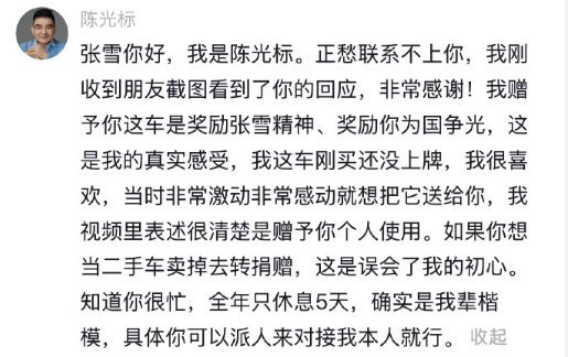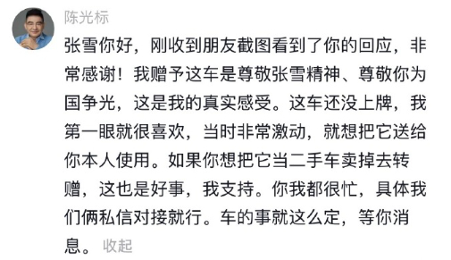 陈光标赠张雪 1300 万劳斯莱斯,张雪:我要,但我不收,8 折变卖全捐公益!陈光标回应张雪要卖车:此举"误会初心",要求车辆留作个人使用,后改口支持捐赠!这就是有钱人的送礼方式,和朴素高手的处理方式,反差真的绝了 张雪想卖陈光标赠送豪车给嫣然捐款
