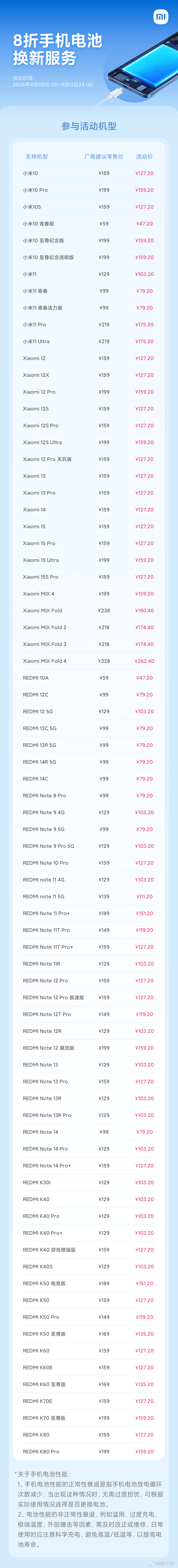 总共推出77款手机电池换新8折活动,最便宜的才47块钱,像前几年的小米12/13/14/15,一块电池也就127块钱,而且不用花人工费