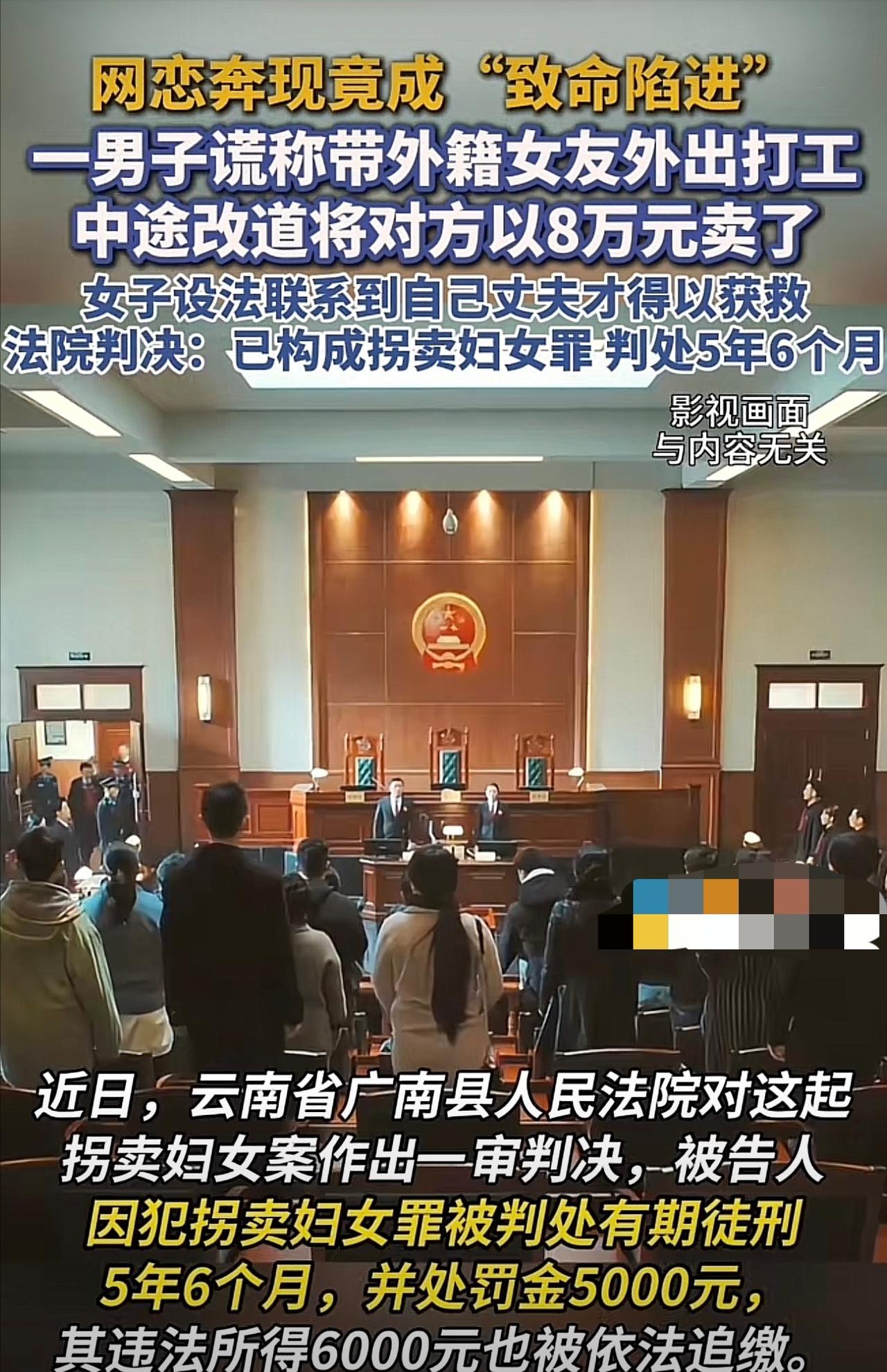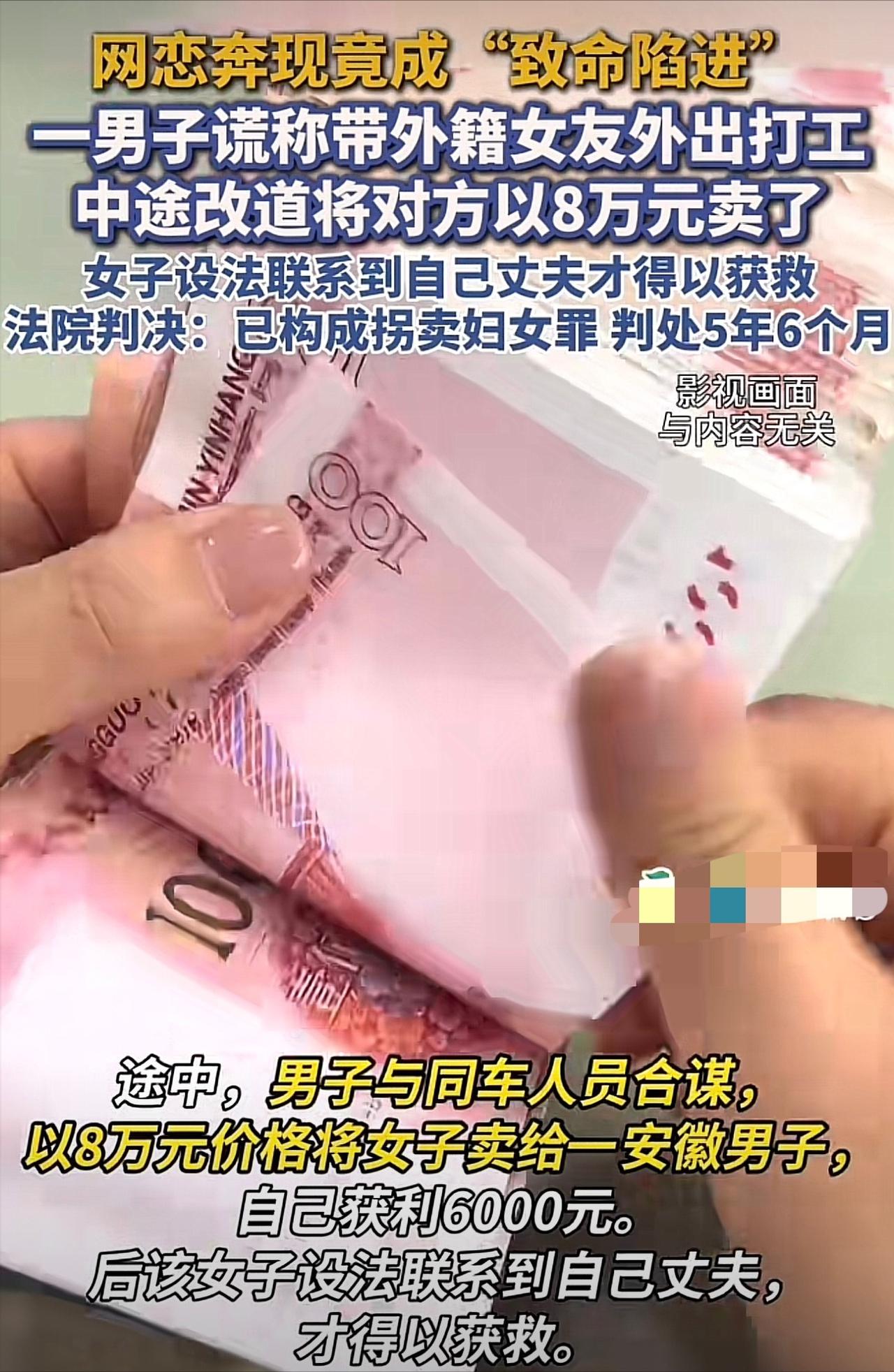 “太炸裂!”云南男子在抖音结识一名越南籍女子,俩人见面后直接同居,男子哄她“去广东打工”,却在途中以8万将她卖掉,事后仅得6000元。女子机智借手机求救,男子终被警方抓获。 长途大巴在夜色中疾驰。 车厢中段的角落里,王成刚与一名陌生男子正在进行一场无声的谈判。“她是从越南过来的,没有身份证。”王成刚压低声音。男子的目光落在陈丽身上,点了点头。“8万。”干脆利落。 就这样,一个活生生的人被明码标价。 而王成刚最终揣进口袋的,只有6000块。 他本以为做成了一笔稳赚不赔的买卖,满心算计着利益,却没料到一切都是陷阱。自以为精明的操作,最终没能换来财富,反而将自己送进了牢狱,落得个身陷囹圄、追悔莫及的下场。 故事的起点听起来很老套:2022年10月,王成刚在某个社交平台上刷到了一个越南女人的帖子。 帖子内容很普通,无非是一些日常生活。但字里行间透露出一个信息:她从越南远嫁到云南,身边没有亲人,日子过得很孤独。 这种孤独,在王成刚眼里不是同情,而是一个明显的猎物信号。 他马上注册了一个小号,把自己包装成“贴心暖男”,每天嘘寒问暖、甜言蜜语。陈丽在国外孤零零的,正缺一个懂她的人。 不到三个月,她已经把他当成了知己。 这招叫精准猎杀——专挑心理防线最薄弱的地方下手。 网恋快一年后,2023年7月,两人终于见面。 一见面,直接发生关系。陈丽以为这是爱情的升华,却不知道对方已经在心里给她标好了价码。 王成刚顺势说:“城里熟人太多,不如我们去广东打工,那边没人打扰,还能一起赚钱。” 陈丽毫无怀疑。她以为自己终于要开始新生活了。 上车的时候,她甚至还有点小激动。 她不知道,等待她的不是流水线,而是一场明码标价的人口交易。 大巴行驶到半路,王成刚开始物色买家。 他找到一个陌生男人,低声说:“我这边有个越南妹,你要不要?” 男人的眼睛亮了。 两人当场谈妥:8万块,一手交钱一手交货。 交易敲定后,王成刚回头对陈丽说:“前面路远,换个车让这位大哥带你,更安全。” 陈丽坐上了另一辆车。 气氛瞬间变了。那个男人不说话,只是时不时从后视镜里打量她。 她这才反应过来:自己被卖了。 大多数人在这种情况下会崩溃,会大哭大闹,会激怒买方导致更严重的后果。 但陈丽选择了另一种方式。 她突然想起要借手机给家里报个平安。男人递给她手机,她假装拨通号码,然后悄悄拨通了远在云南的丈夫的电话。 丈夫一听到求救信号,立刻报警。 警方火速定位,半路上把那辆车截住,陈丽成功获救。 面对绝境,她的反应不是恐惧,而是冷静地寻找出路。这需要的不仅是智慧,还有极大的心理素质。 2024年3月,这起案件曝光。2026年3月30日,深圳新闻网对此进行了详细报道。 法院依法作出终审判决:被告人王成刚犯拐卖妇女罪,判处有期徒刑五年六个月,并处罚金人民币五千元;其违法所得人民币六千元,依法予以追缴。 他只拿到了6000块,却搭进去5年半的自由。 这买卖亏大了。 法院的依据很明确:《刑法》第240条规定,拐卖妇女的,处5年以上10年以下有期徒刑。虽然陈丽是越南人,但她在我国境内被害,我国法律拥有全部管辖权。 买家那边也没好果子吃。根据我国《刑法》第二百四十一条规定,收买被拐卖的妇女、儿童的行为,同样依法构成犯罪,将被追究相应刑事责任。这一规定明确了收买行为的违法性与应罚性,彰显了法律对被拐群体权益的坚决保护。 整个链条,从卖家到买家,一个都跑不掉。 但这个案子最让人细思极恐的地方,不是王成刚有多坏,而是陈丽的遭遇太有代表性。 2014年,红河州曾发生过一起更离谱的案件:杨某光在几年内拐卖了12名越南籍女性。 这些女性都有一个共同点:远嫁中国,身边没有亲人,语言不通,社交圈狭窄。 她们是天然的猎物。 网络时代里,屏幕两端看似近在咫尺,却常常隔着人心与算计。那些温柔的话语、动人的故事,未必是真心相待,很多时候不过是精心编织的谎言,藏着不为人知的陷阱,一不小心就会让人坠入深渊。 网恋、带你打工、介绍对象——这些听起来很普通的词汇,背后可能隐藏着肮脏的交易。 法律是最后的防线,但它只能惩罚犯罪,无法阻止每一个潜在的受害者走进圈套。 所以问题来了:谁来保护那些远嫁边疆的女性? 答案是多元的。警方需要加强边境治理,打击非法中介。平台需要负起责任,及时封禁可疑账号。但最重要的是,每个人都要提高警惕。 信任一旦被践踏,心灵上的伤口可能永远不会愈合。 陈丽虽然获救了,但她对网络世界的那份信任,已经碎了一地。 这才是最昂贵的代价 参考信息:男子与越南籍女子网上相恋发展为不正当男女关系,男子称带该女子打工,转头将其8万卖掉,仅分得6000元 2026-04-0109:36·观威海