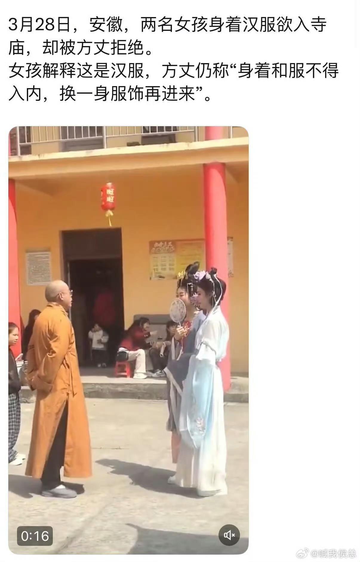 去庙里烧香,遇到方丈在阻拦两个小仙女,原来方丈认为小仙女们穿的是和服,庙里不接待。小仙女极力解释说她们穿的是汉服,方丈回应叫她们换一身衣服了再来,佛门清净地,方丈为啥要管这民间的俗事?在古代的时候,王公贵族家的小姐、阔太可都是寺庙的常客,也是香火钱的主力,有很多方丈可都是出门远迎,亲自接待,单独诵经念佛保佑的。