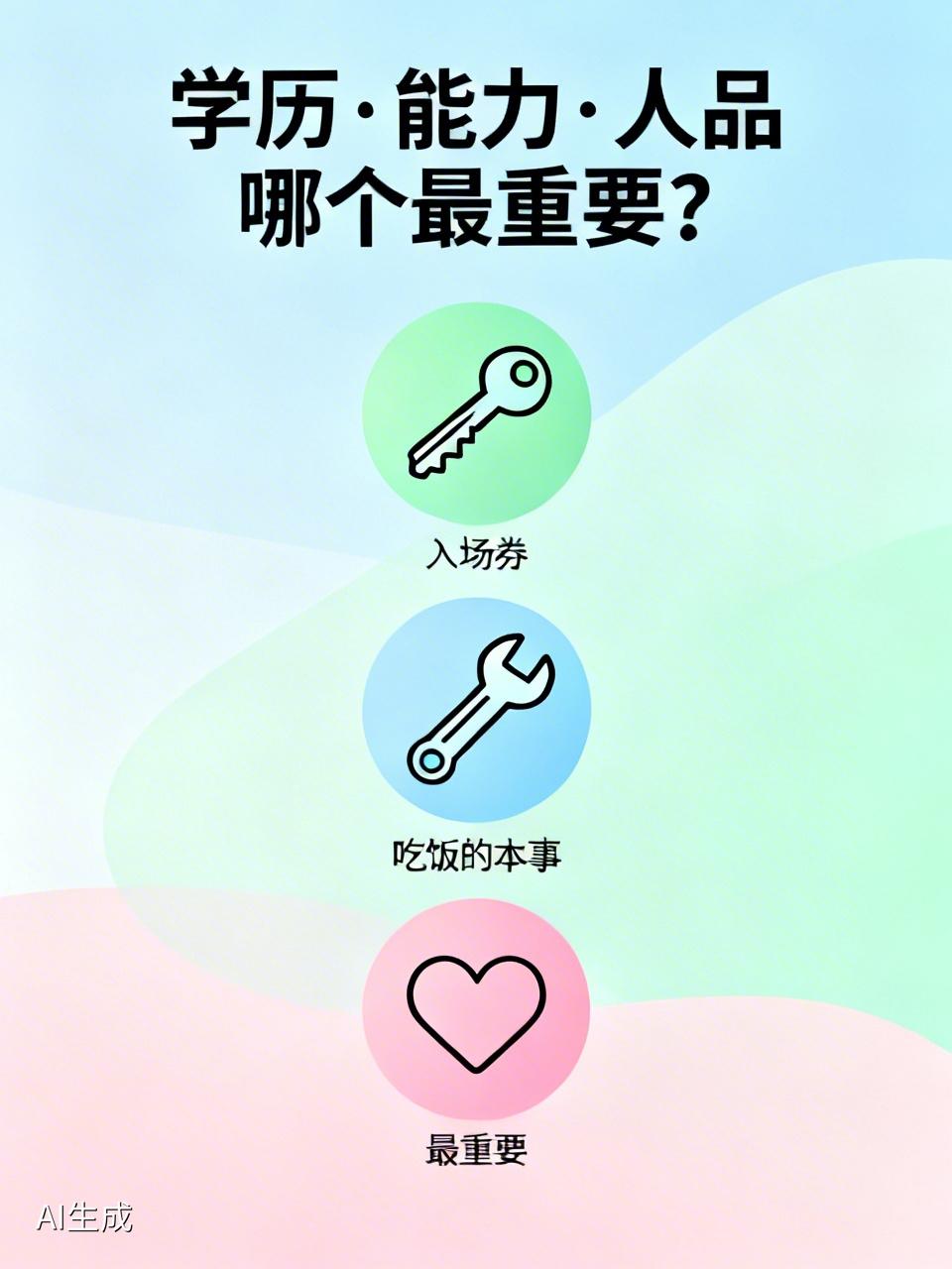 不过,我觉得人品才是最重要的。学历高、能力强却人品差,就像一颗定时炸弹。有德无才是次品,有才无德是危险品。学历决定起点,能力决定高度,而人品决定你能否平安落地。先把人做好,路才能越走越宽。